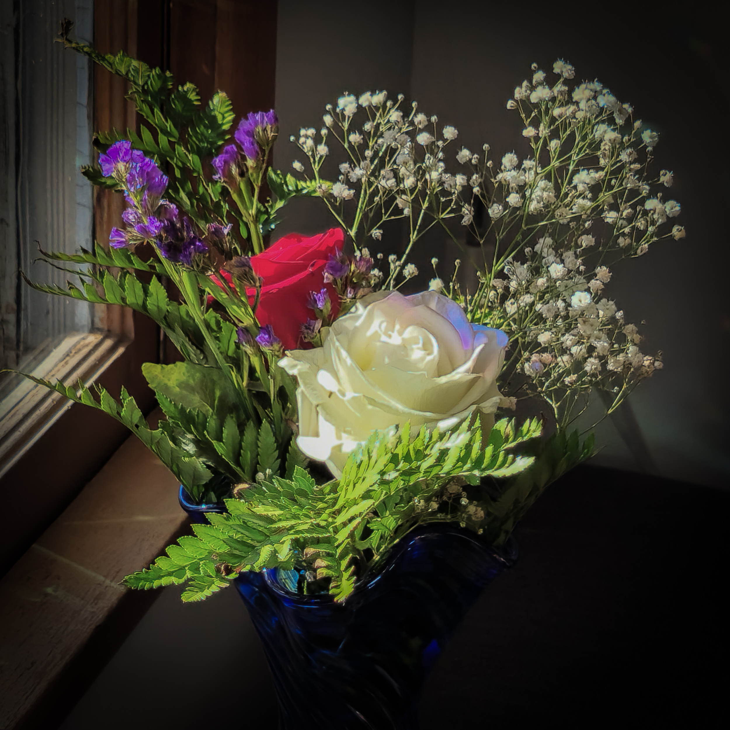 Ginger’s Flowers. Copyright © 2026 Gary Allman, all rights reserved. Ginger loves to sit here in the sun in the winter. I liked the light on flowers and thought I’d try to capture it. Unfortunately, the battery was dead on my camera, so, I used my cell phone instead. The odd colored highlights are caused by the crystals we hang in the Sparkle Zone’s windows.