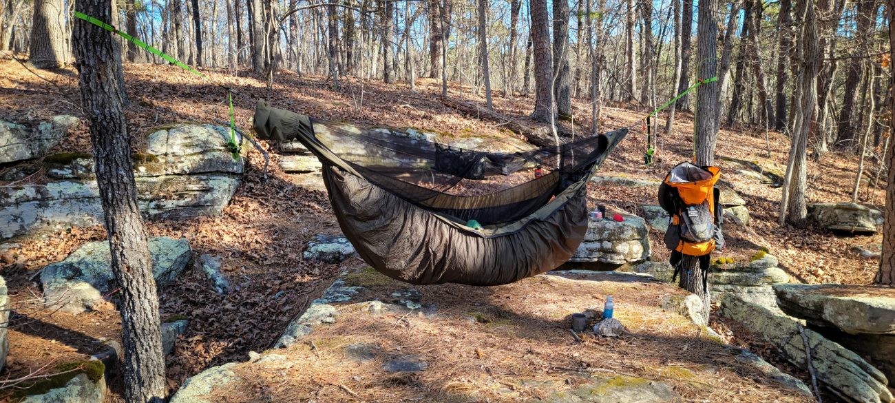 Camped at ‘Paddy Creek Trolltunga’ — this is such a great place to hang a hammock. Not so good if you want to set a tarp, though. I never have when stopping here. Backpacking the Big Piney Trail, February 2026. Copyright © 2026 Gary Allman, all rights reserved. -