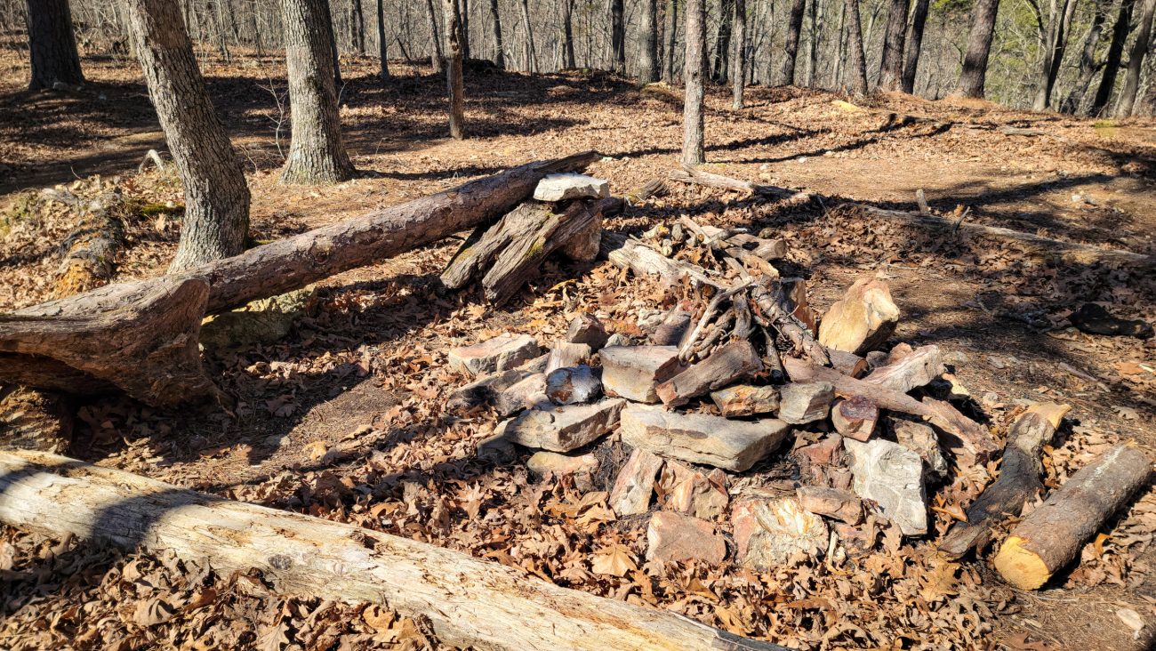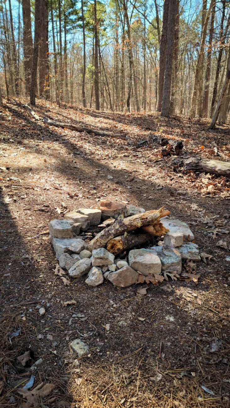 The trailside fire rings have been rebuilt — Backpacking the Big Piney Trail, February 2026. Copyright © 2026 Gary Allman, all rights reserved. At first I thought it was just the odd one here and there, but all the fire rings I encountered and remember seeing on previous trips had either been rebuilt or cleared away. Many, like this one, had a supply of wood in them or nearby. Odd. It was like someone was preparing for a massive influx of hikers.