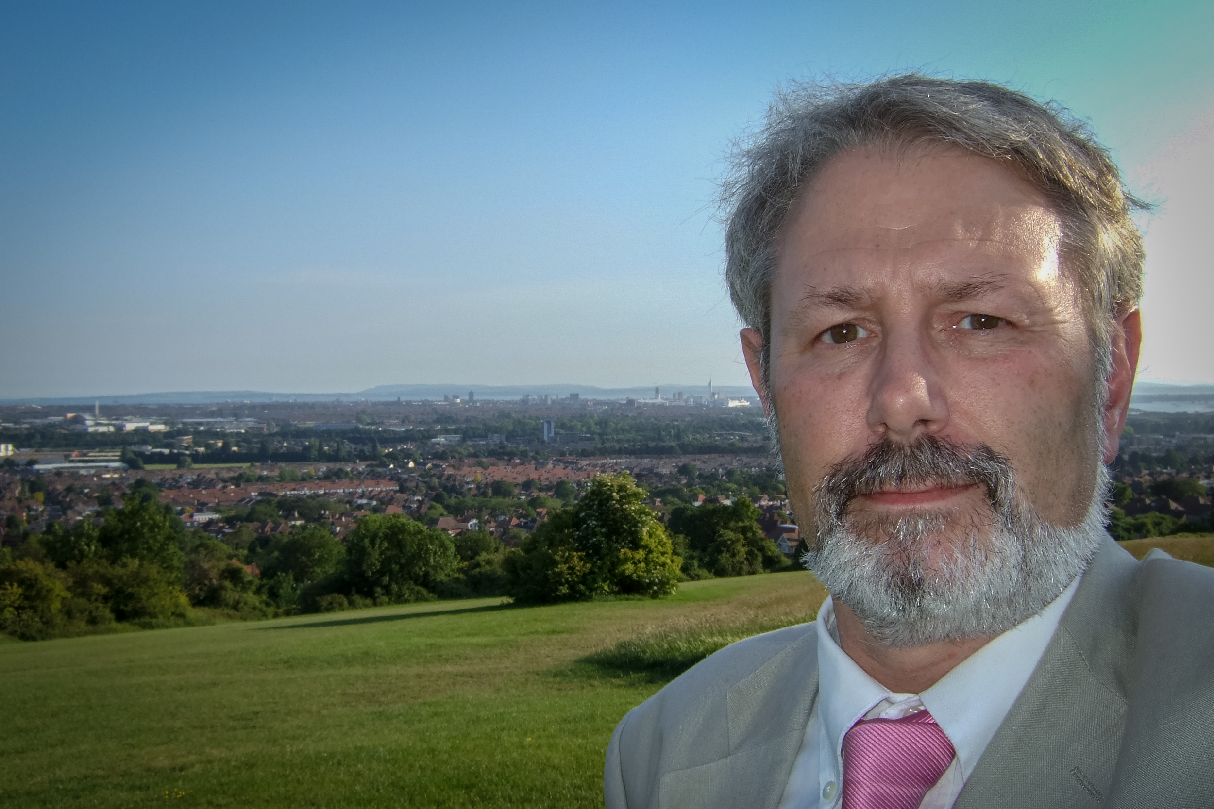 I was born in Portsmouth; we moved away when I was eighteen months old and returned when I was sixteen. Portsmouth is mainly built on an Island; surrounded by the Solent to the South, Langstone Harbour to the East, Portsmouth Harbour to the West, and Ports Creek, an almost dried up creek at low water to the North. Just to the North is Portsdown Hill (where I am) which overlooks the city. Looking Southwest, behind me can be seen most of the city.