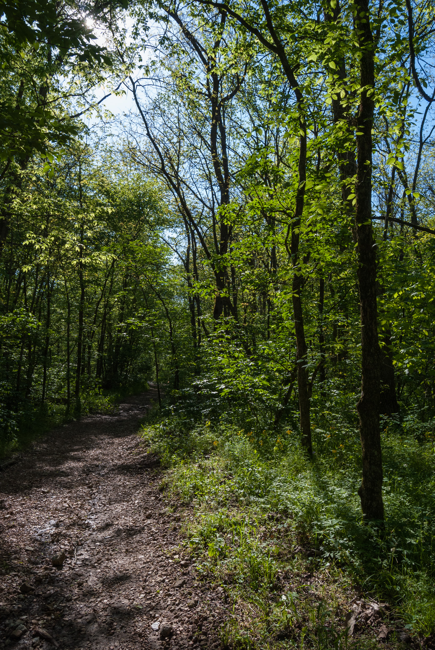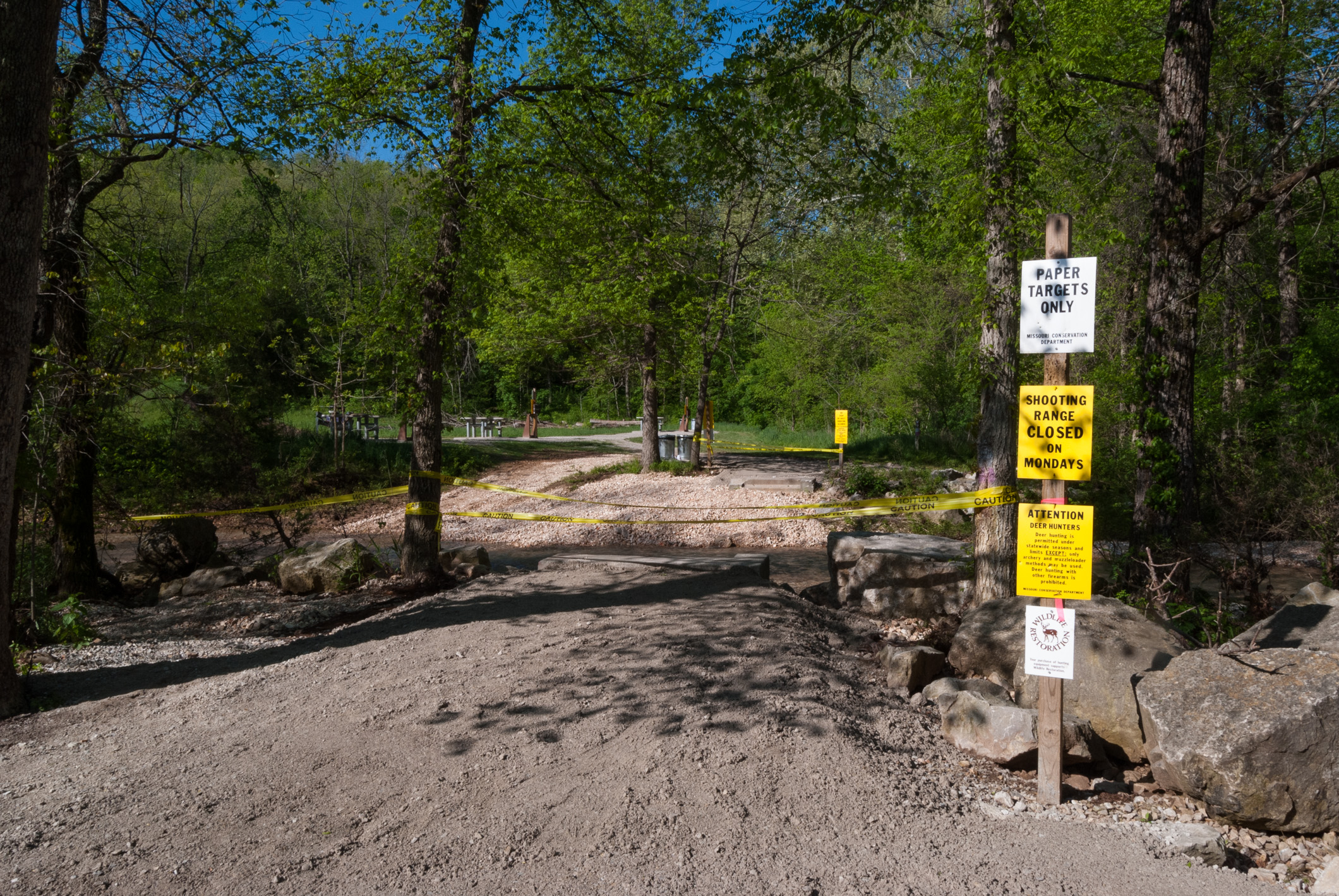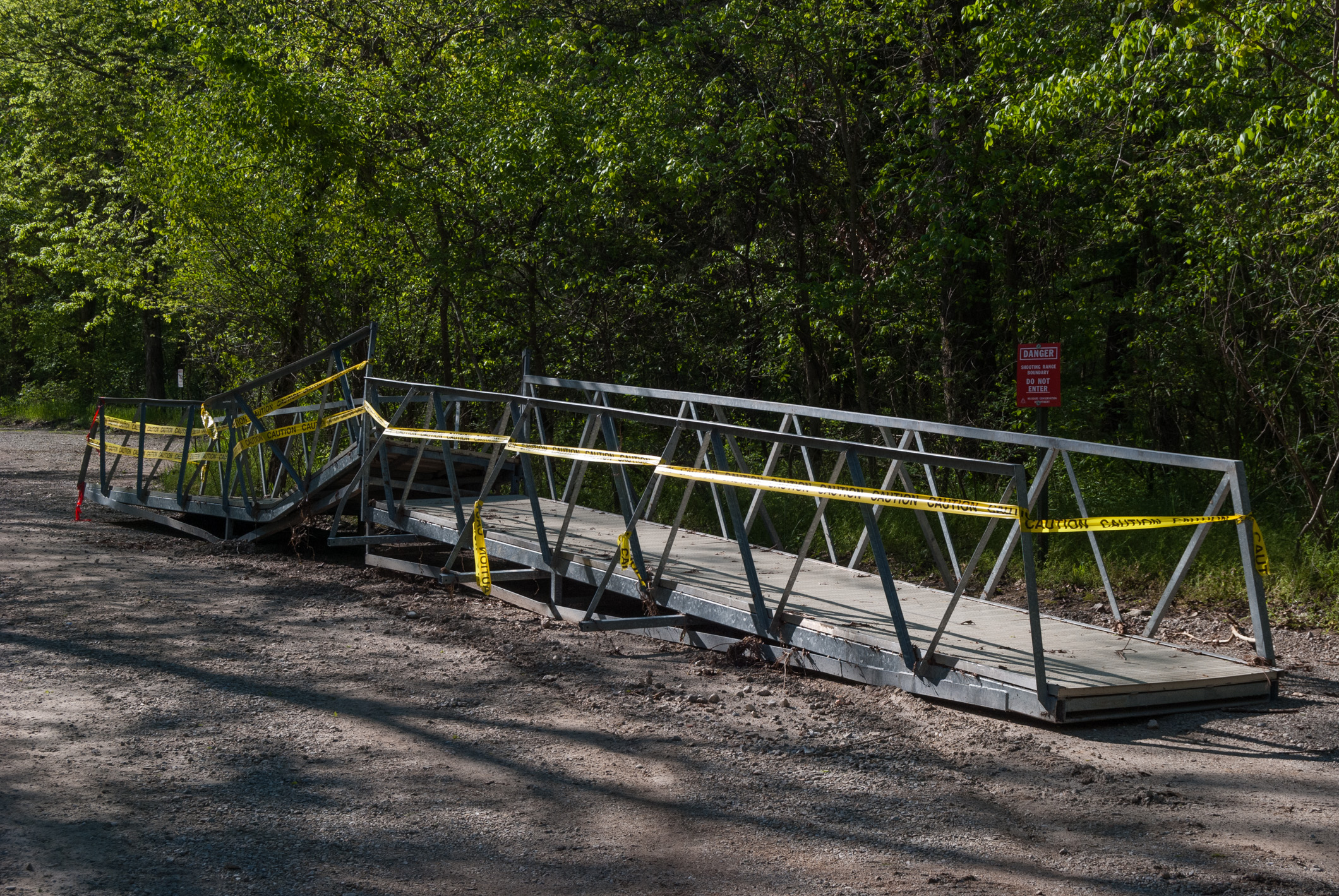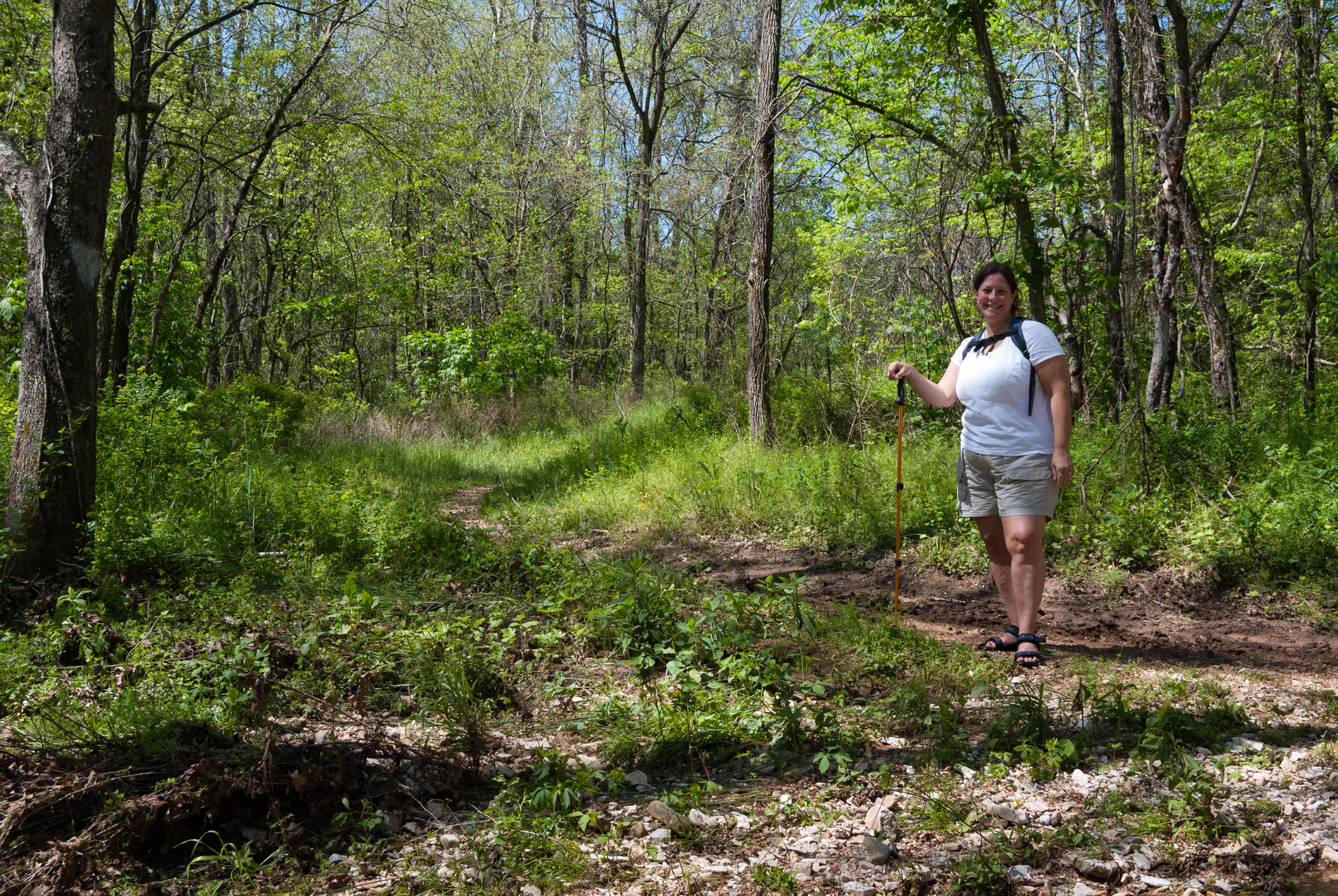 Today we hiked the white and orange trails at Busiek, only this time we did them backward, starting with the Orange trail and then the White trail. This had the advantage of getting the most of the creek crossings out of the way on the way out instead of on our return. The hike started with an unexpected extra crossing because the bridge across the creek to the shooting range was washed out.