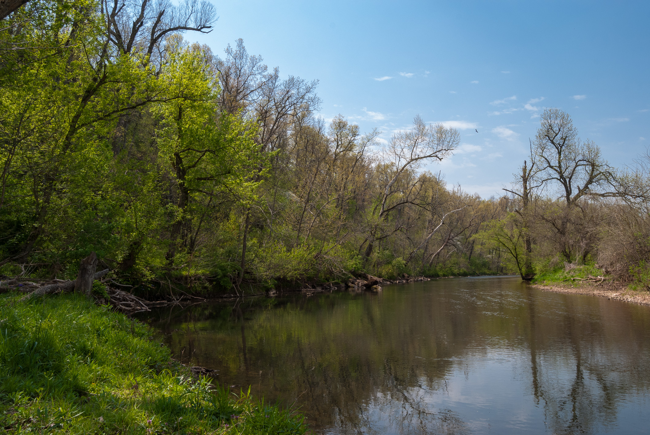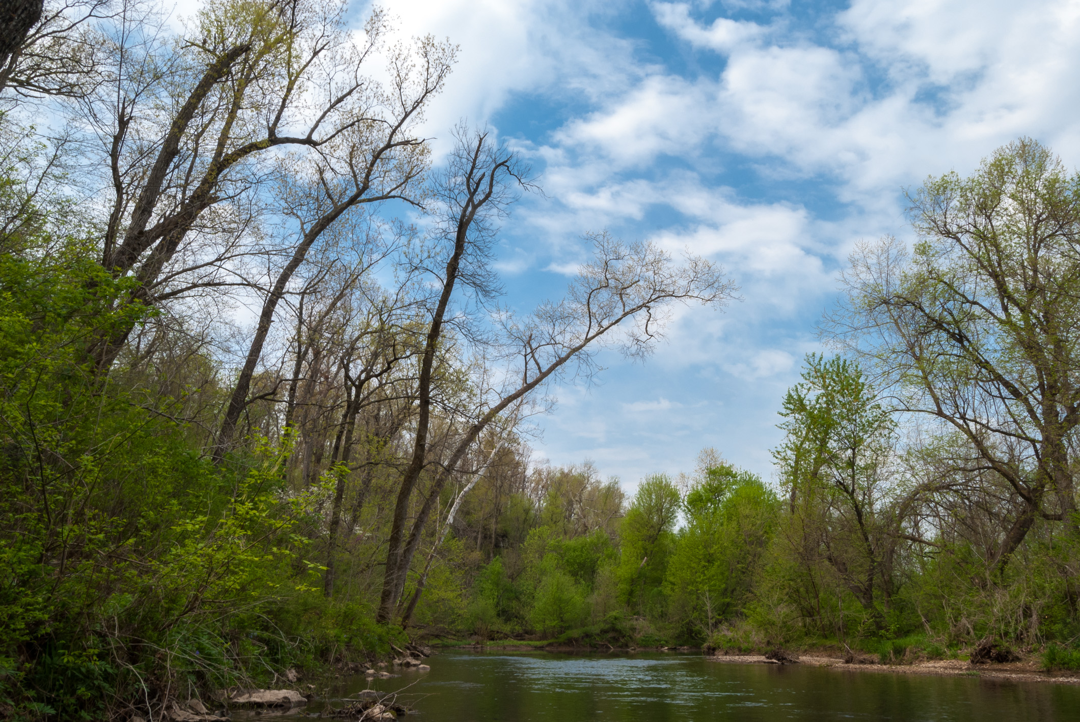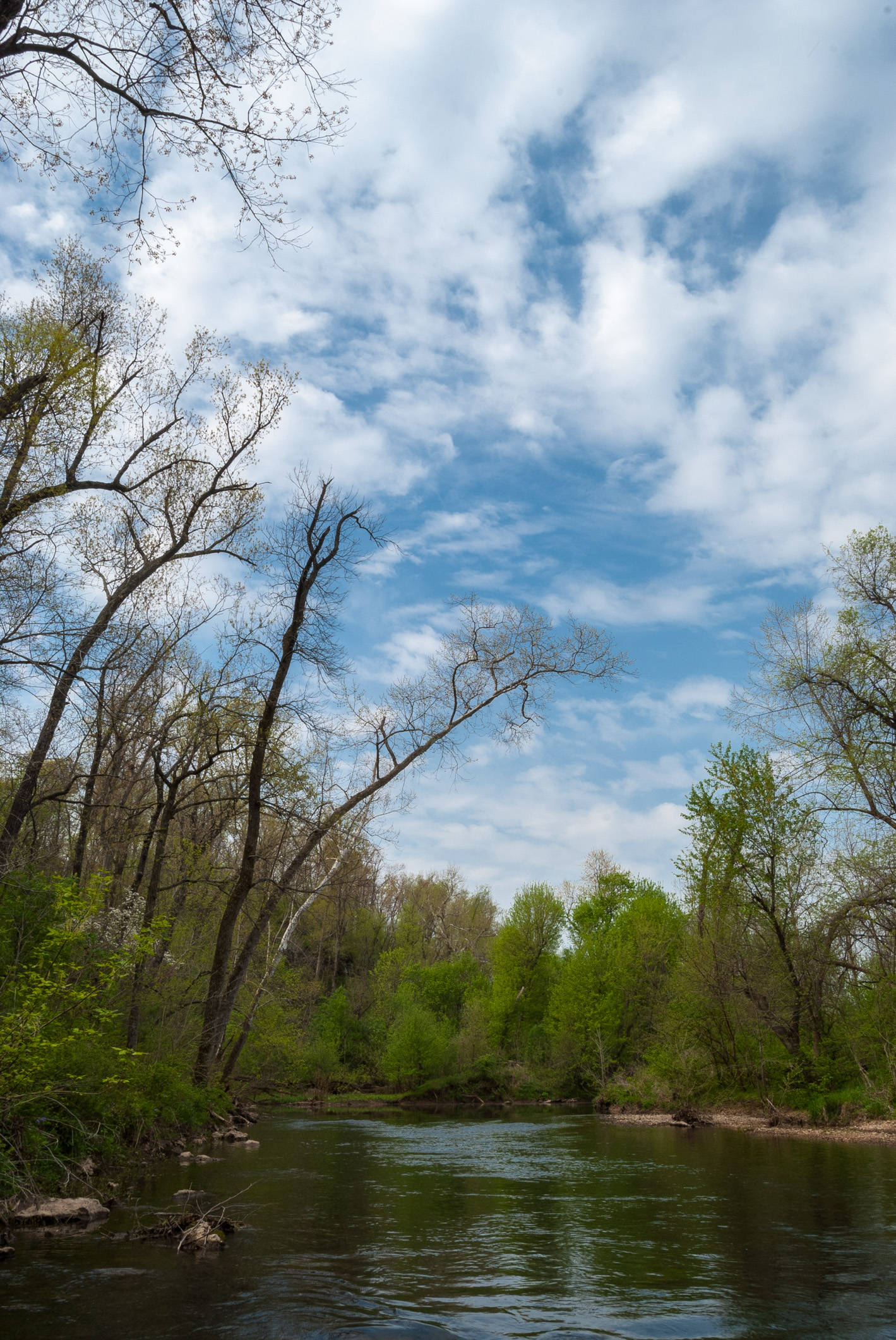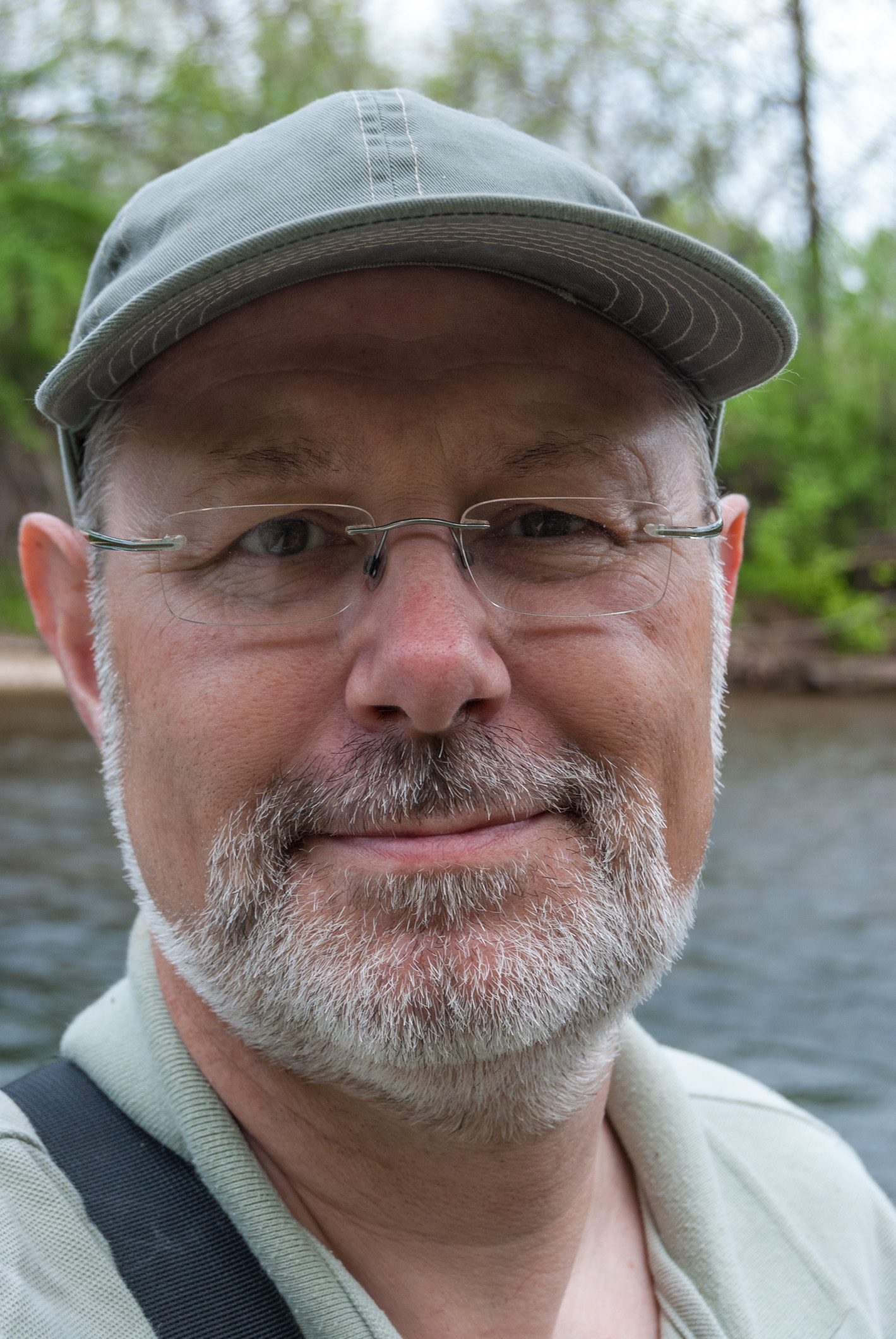 The north part of the farm ends in 90 foot bluffs down to the Little Sac River, we followed the fence line down a hollow to the river and stopped to take pictures along the way, and I suffered equipment envy at Loyal’s Hasselblad, but at least I don’t have to wet process my pictures. I took today’s self-portrait balancing on a downed tree.
