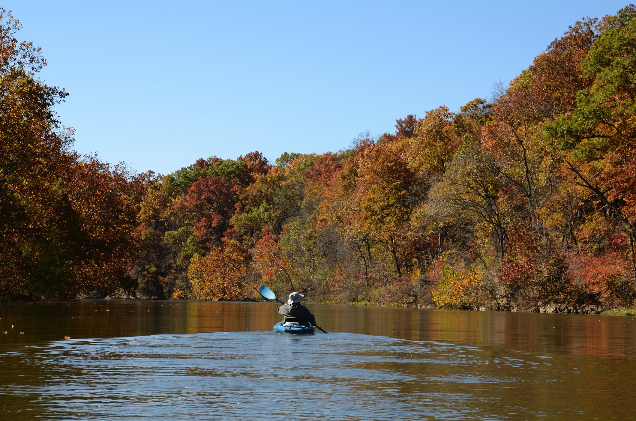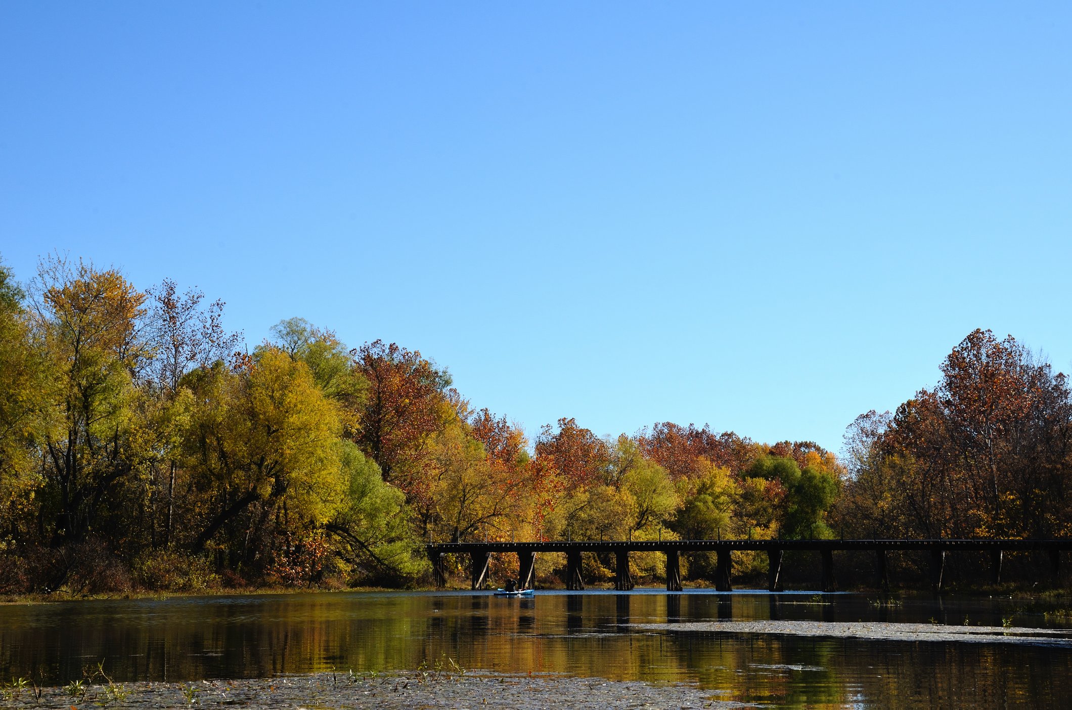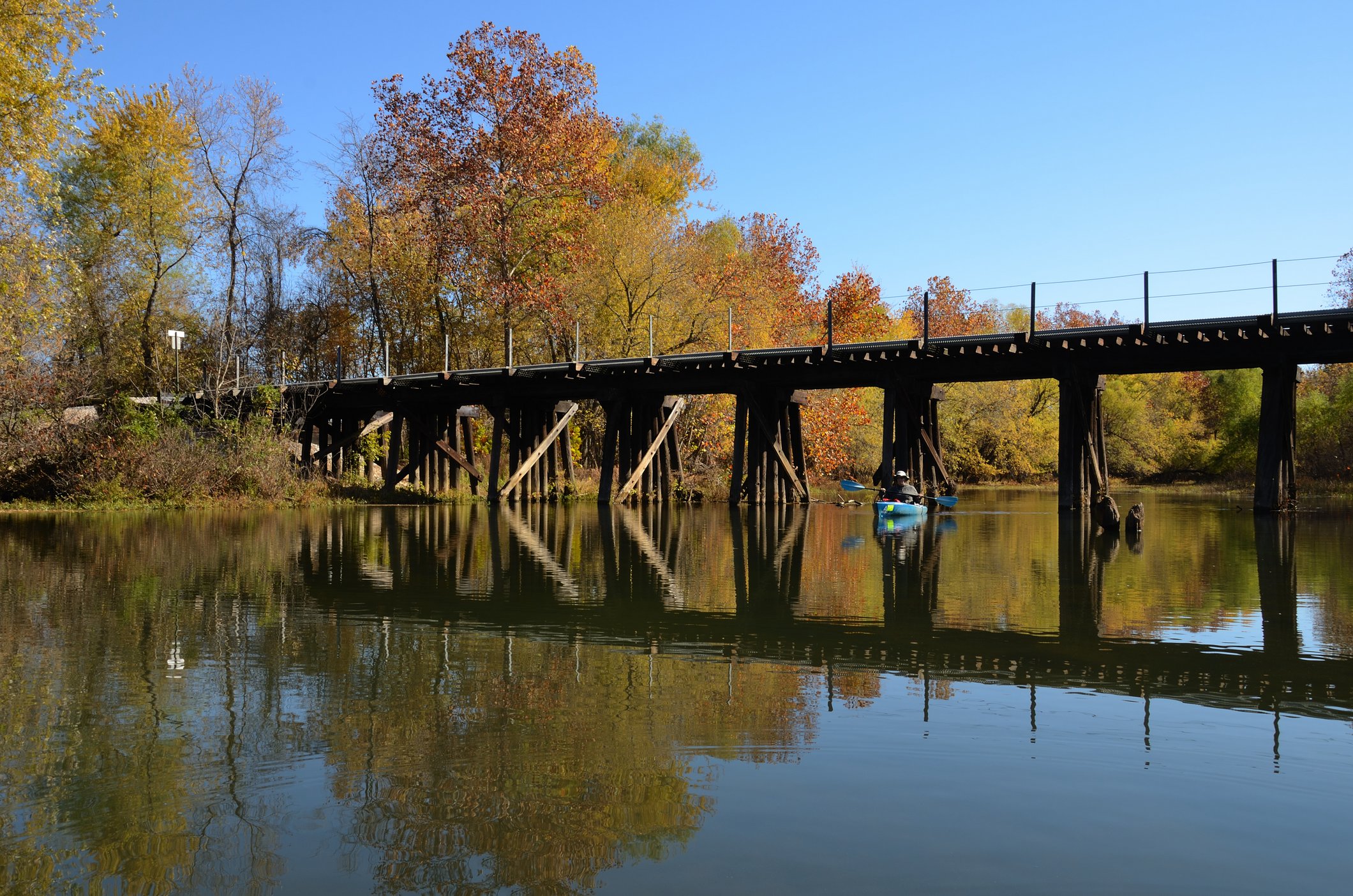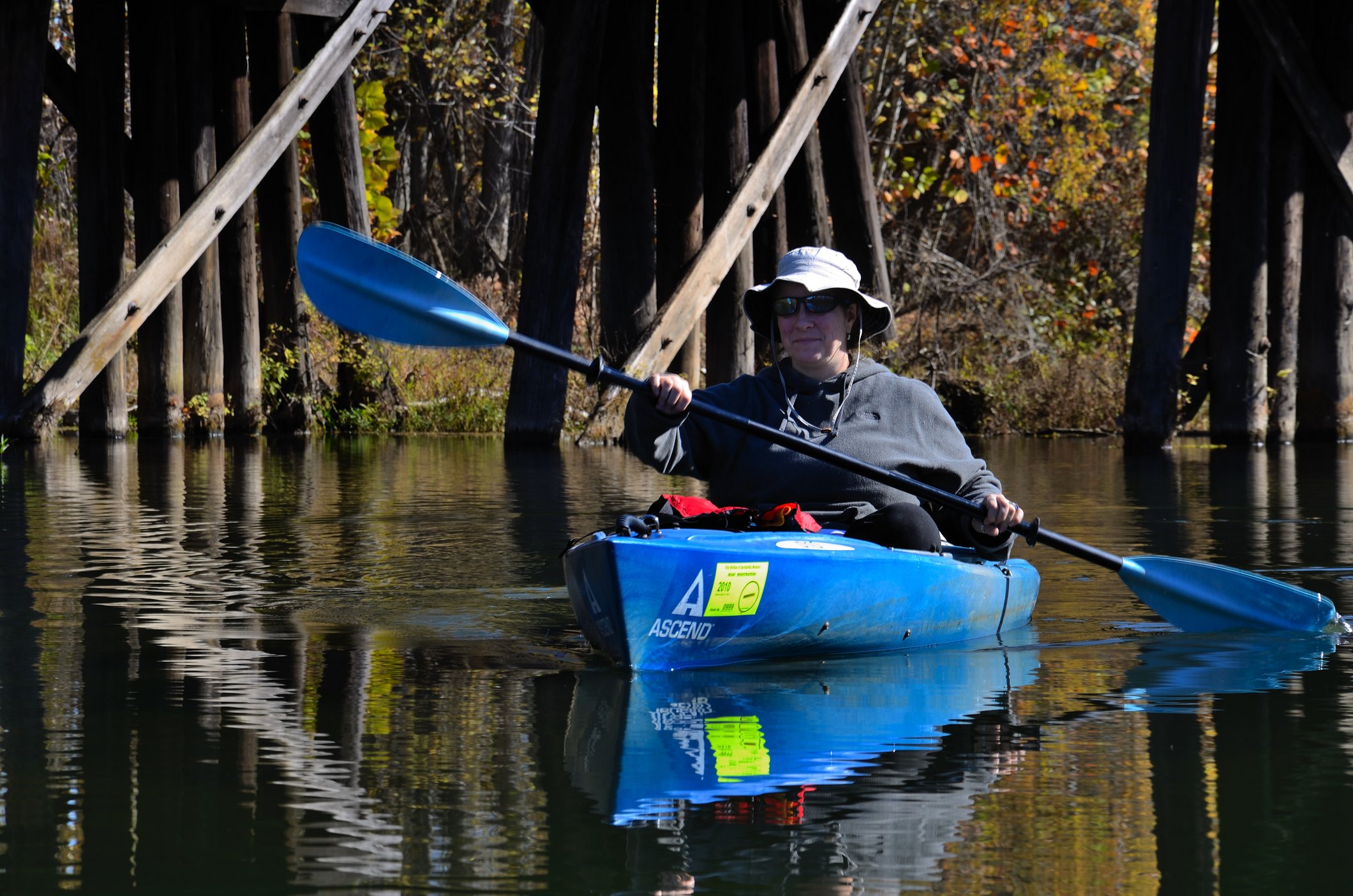 Ginger kayaking under the railroad Bridge onthe James River at the Springfield Nature Center