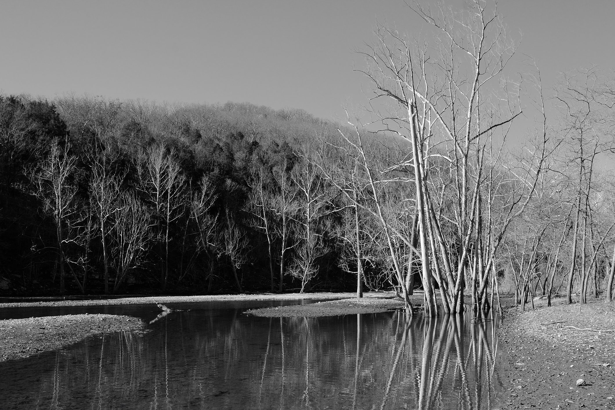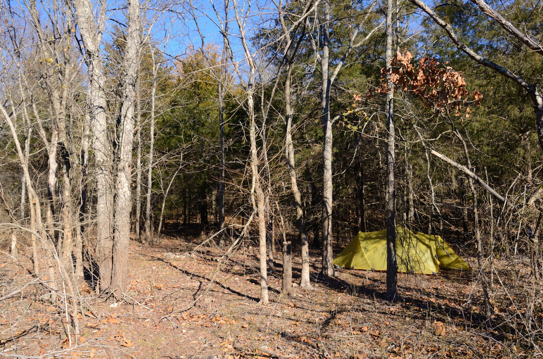 My sunbathing was interrupted by a pack of horses crossing the creek, which confirmed my suspicion that there was a trail on the other side. This was good because when I’d spotted the chairs in the mud across the lake yesterday I’d thought that a picture of me sitting in one might make a fitting last 365 photograph. And so it turned out. Ginger declined my invitation to join me for my last picture – though we did try a few and they ended up on the cutting room floor. For a tripod I used one of the rusting chairs supported by my hiking pole. Close inspection showed that the chairs – like a lot of things in the Ozarks had been used for target practice at some point, as each had several bullet holes.