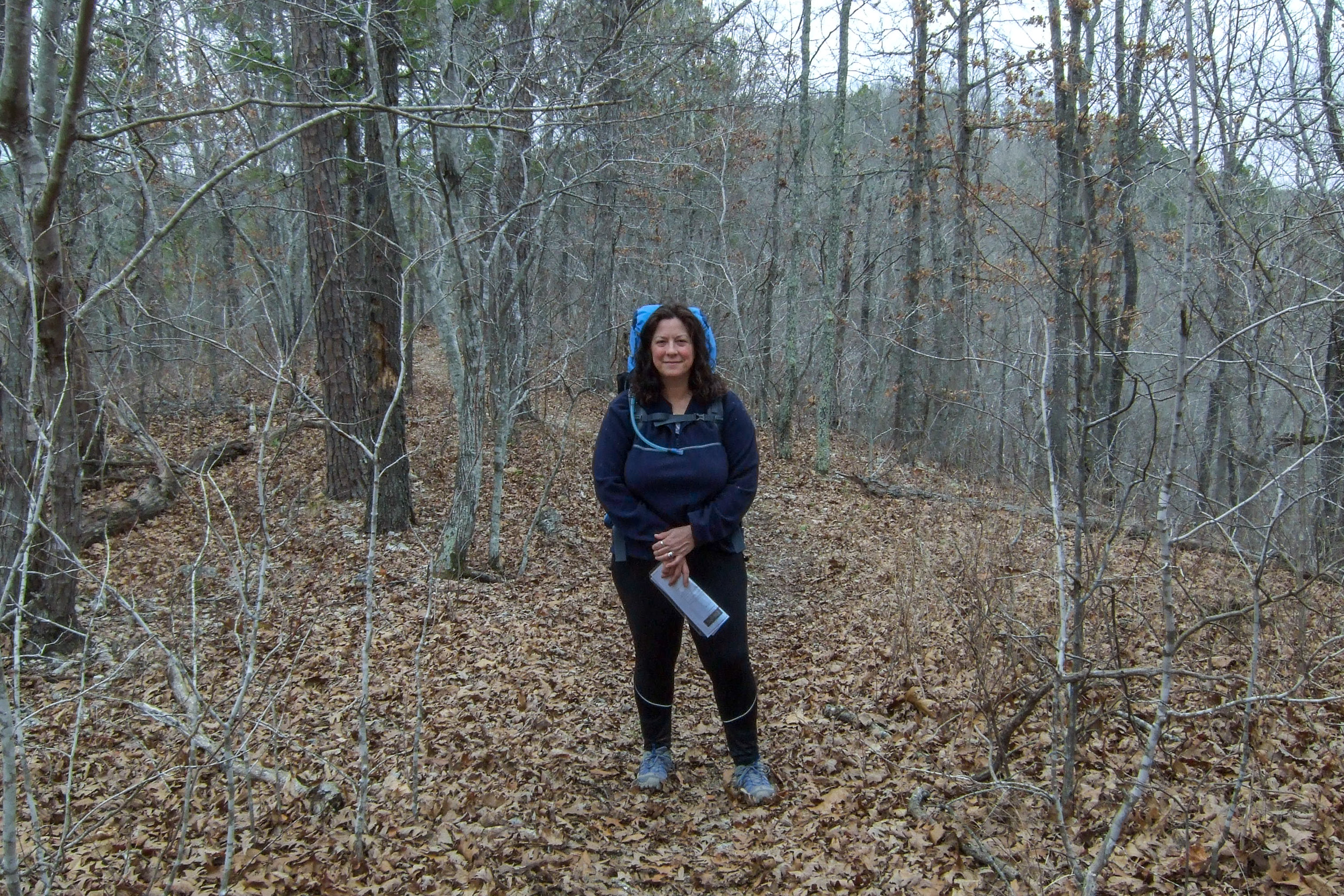 We had a good hike along the Devils Backbone down into Mary Hollow. Ginger particularly liked all the pine trees at the start of the hike. The Devils Backbone was quite impressive with a significant drop off on each side, which is where I took today’s picture. The point where the trail drops into Mary Hollow is incorrectly marked on the map (it comes out about an eighth of a mile to the east of where it is shown), which caused us a bit of backtracking while we looked for the trail to McGarr Spring. We found the trail but couldn’t find the spring, there was evidence of water but there was none running.