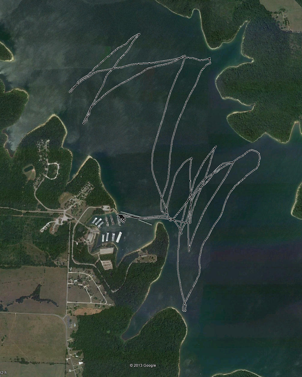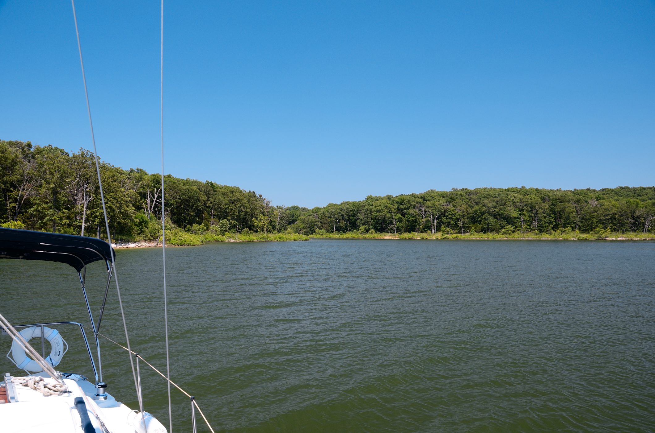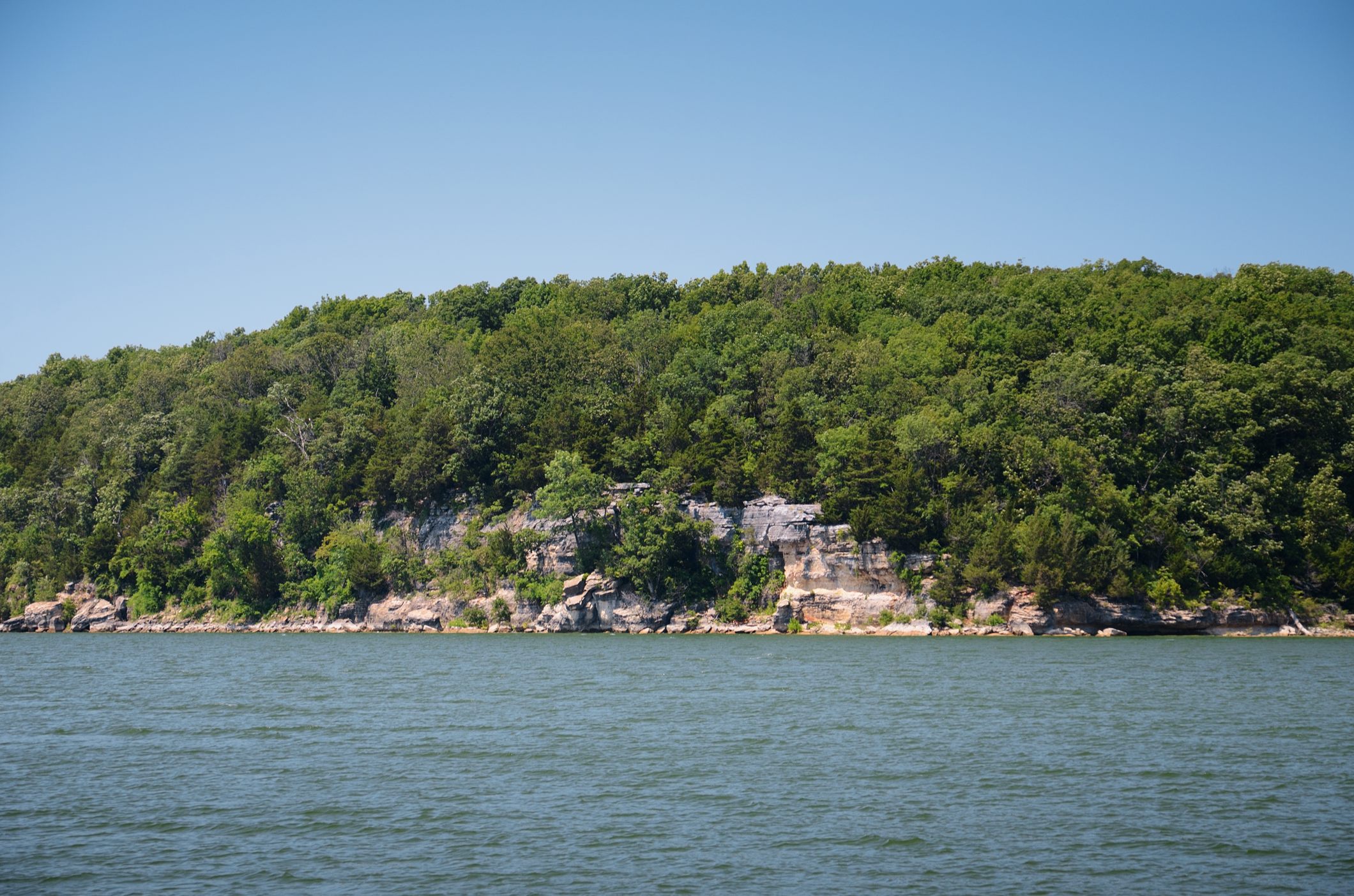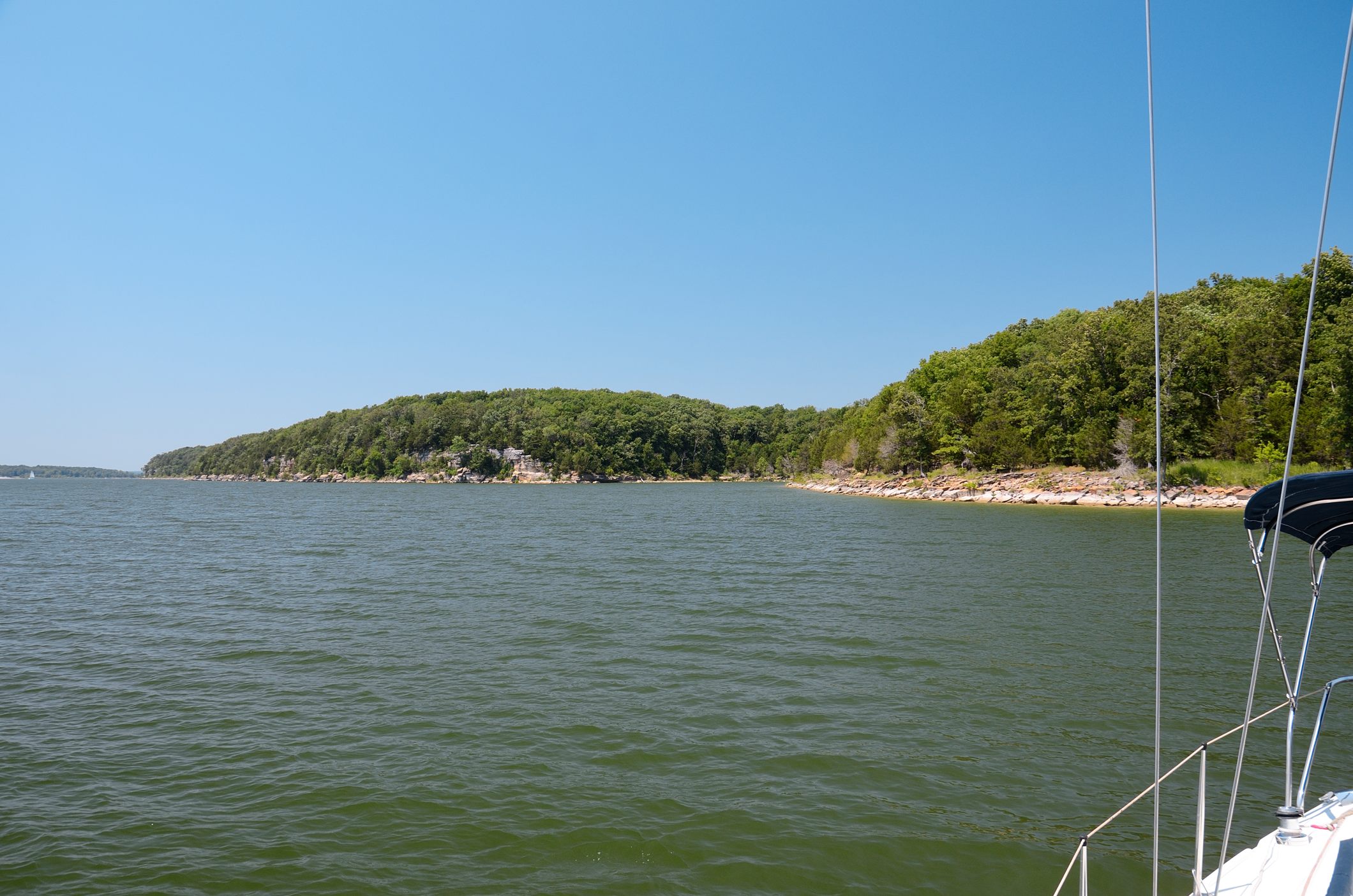 At the next cove we went closer to shore and made absolutely sure we were stopped in the water before I chucked the anchor over the side. It held beautifully. There we were anchored in a little bit of Ozark’s Lakes Beauty. Superb greenery topped by a deep blue sky. Off to stern (north), there was a small bluff just to add a little bit of variation.
