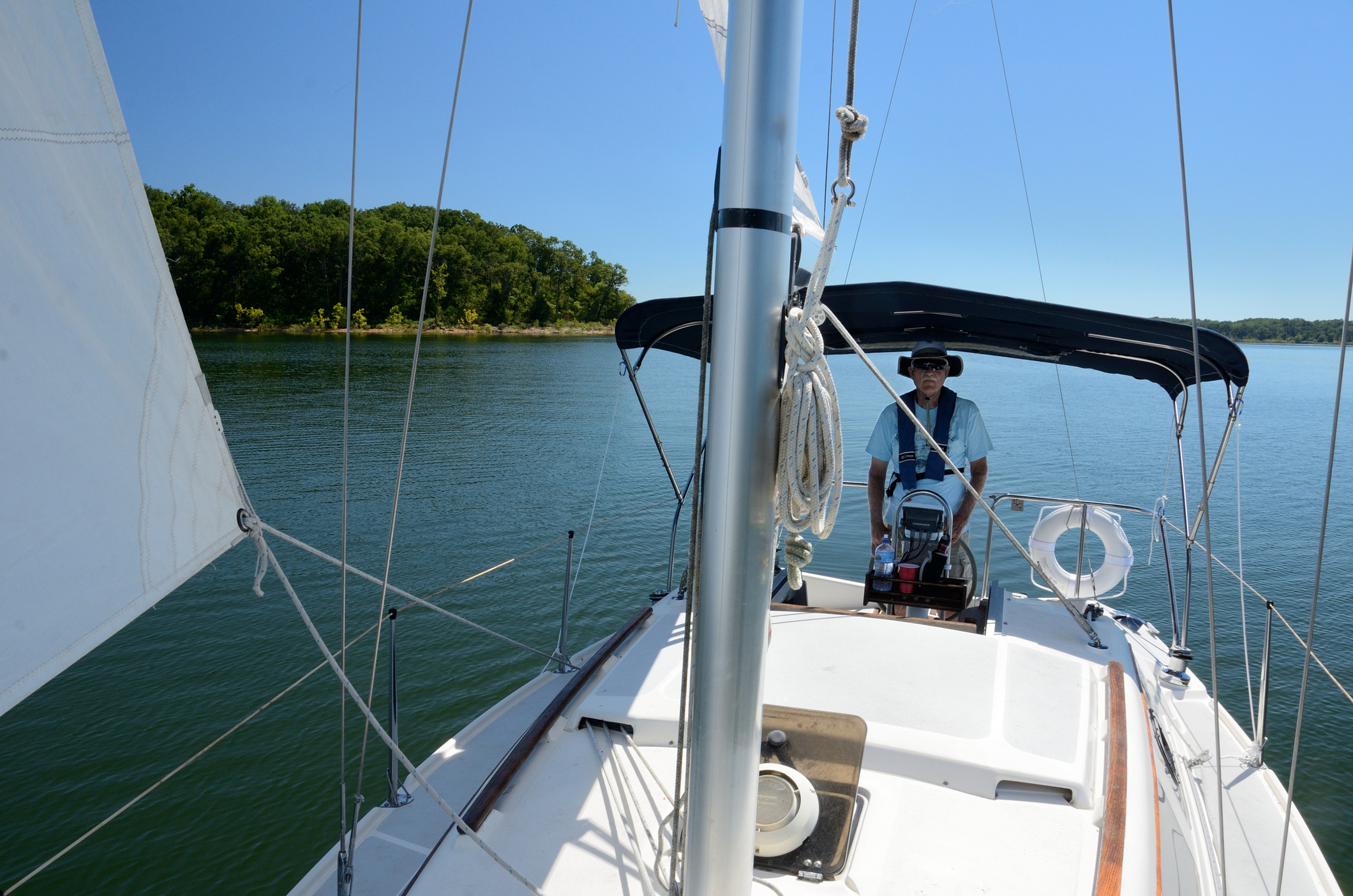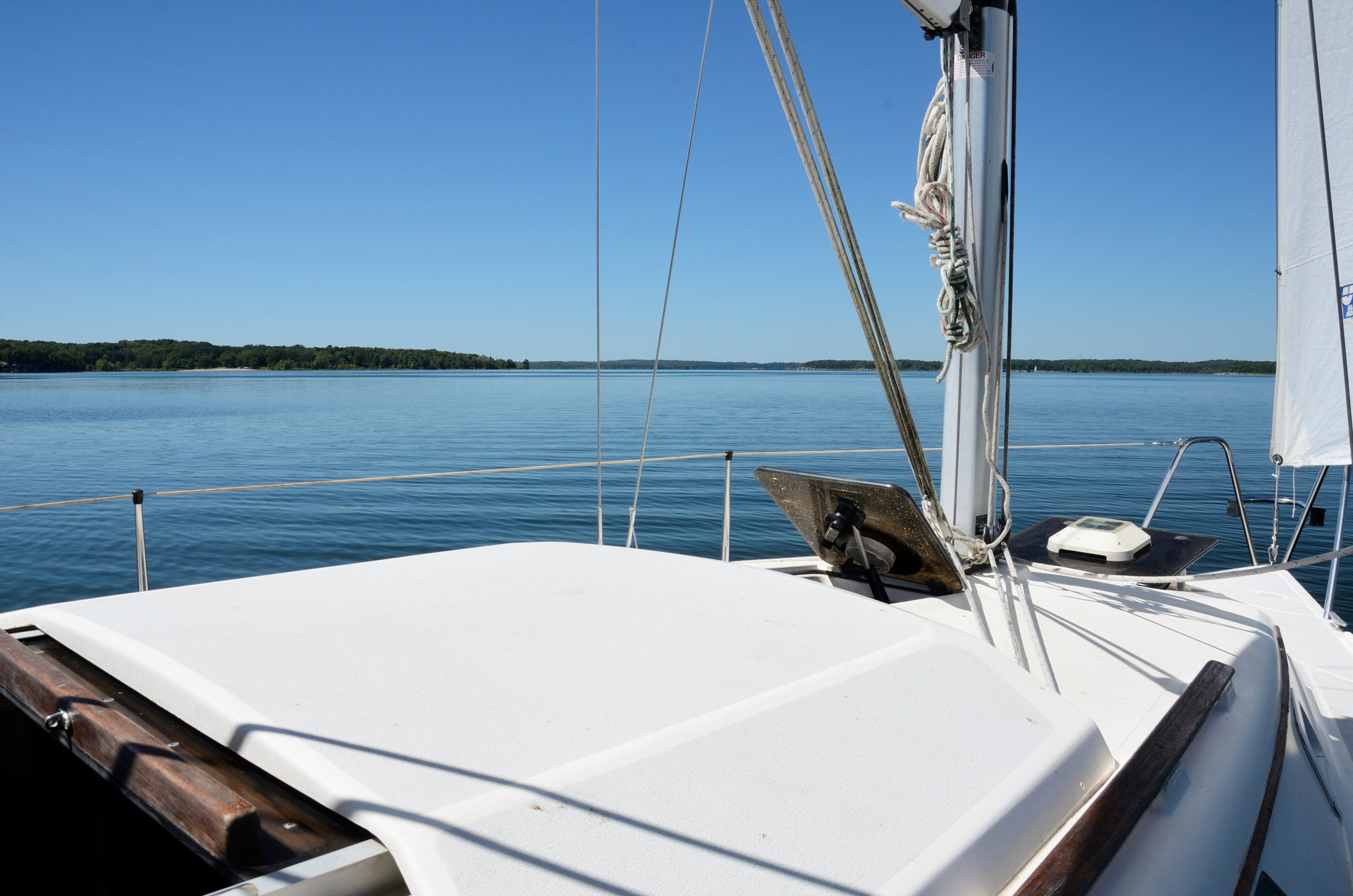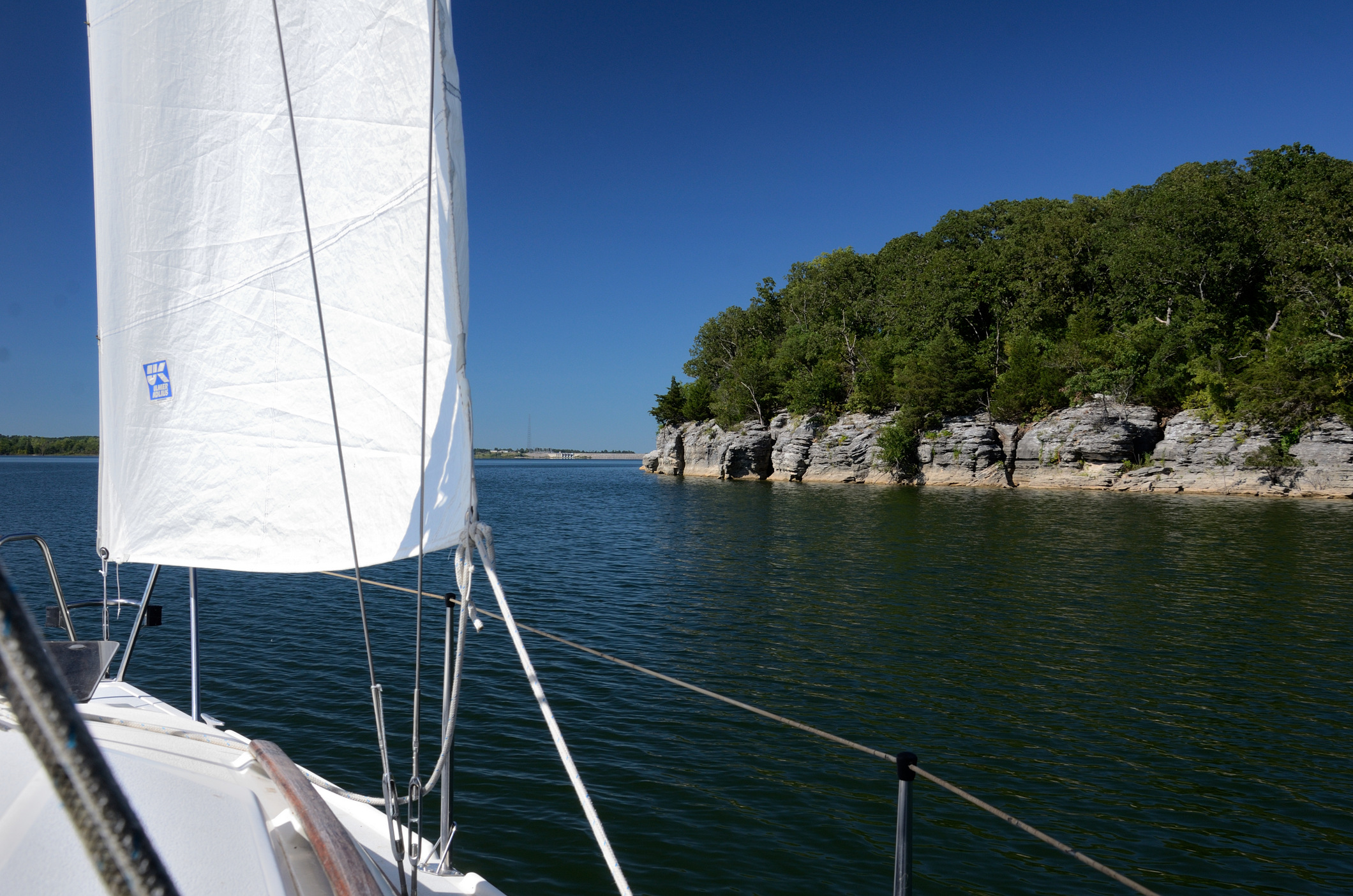 At the north end of the lake, we managed to pick up a small breeze, just enough to get us moving for a while. Luckily the wind stabilized in direction so we managed to crawl our way back down the lake under sail. Finally, we gave up and started the ‘iron topsail’.