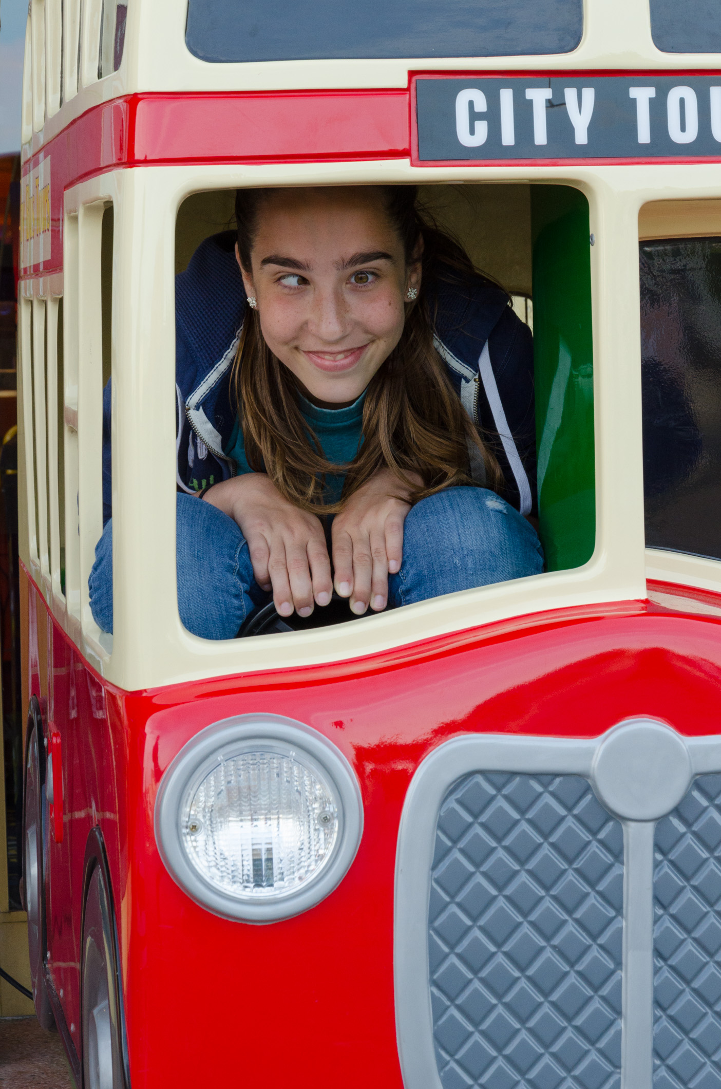 My plan, duly executed, was to walk along the seafront to the Harbour Station and catch the train back to Havant from there. At Clarence Pier, Lanie could not resist getting into this double-decker bus.