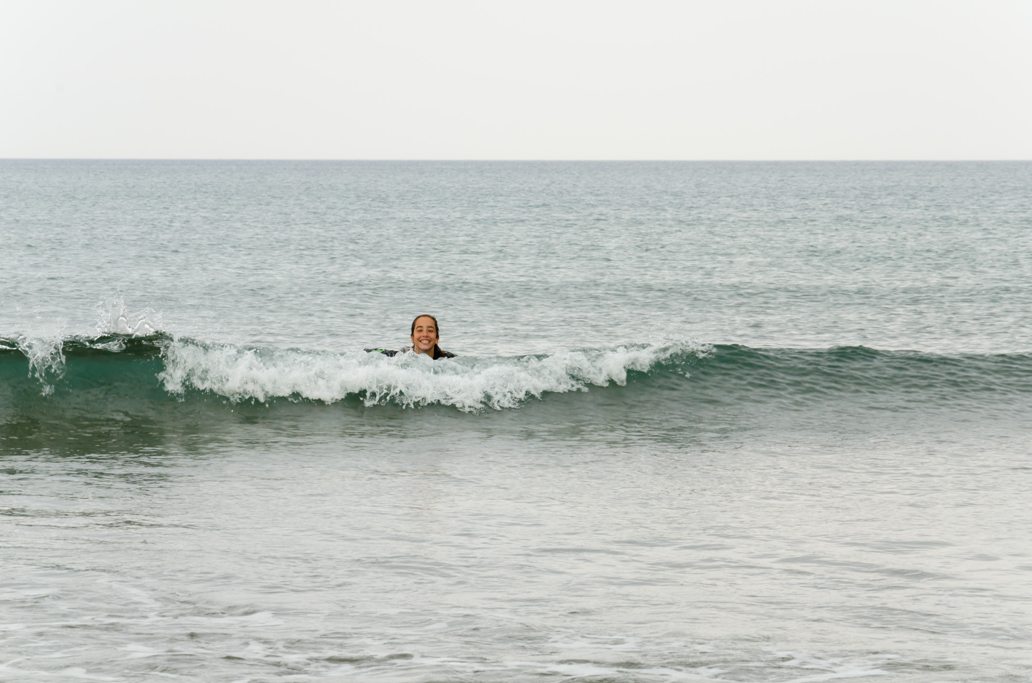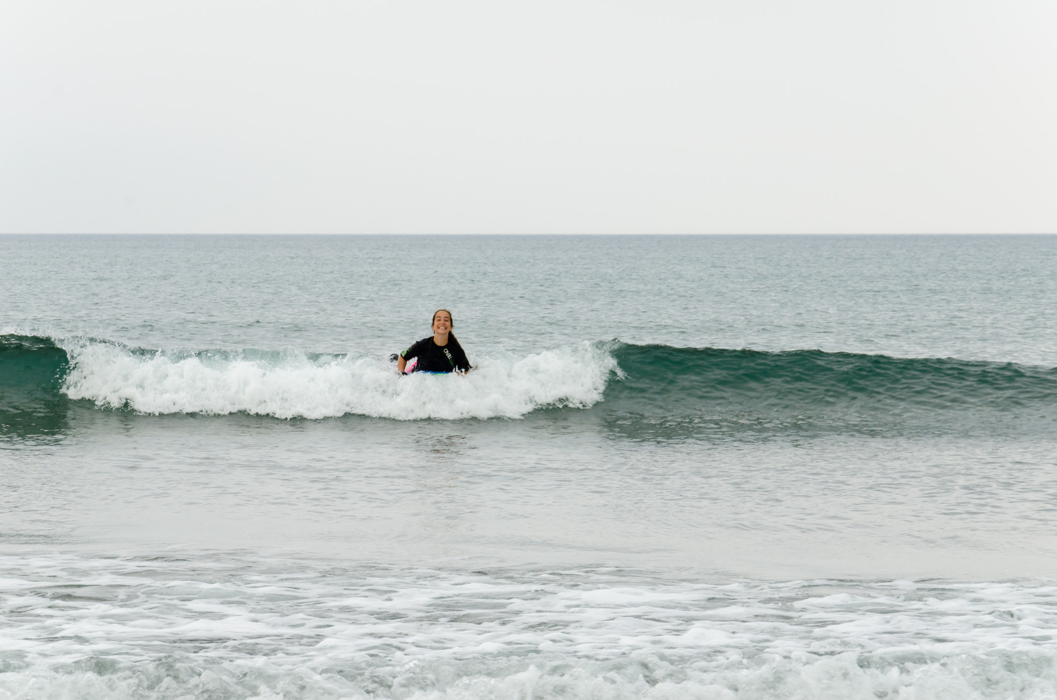 Not enthused by the weather – which was slightly drizzling, we followed along later to see how they were getting on. Despite the lack of surf, Lanie seemed to enjoy herself. Though it must have been really cold.