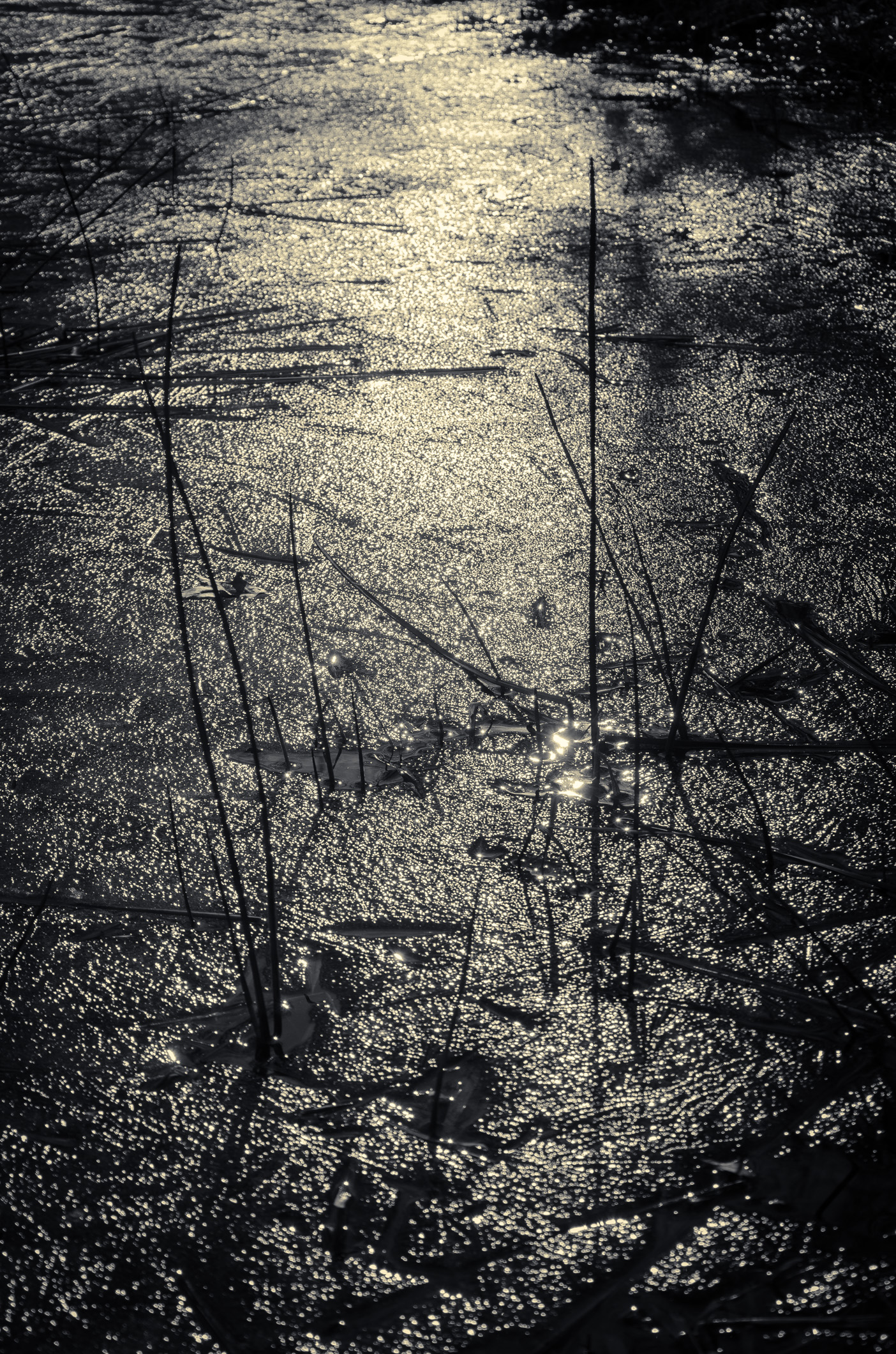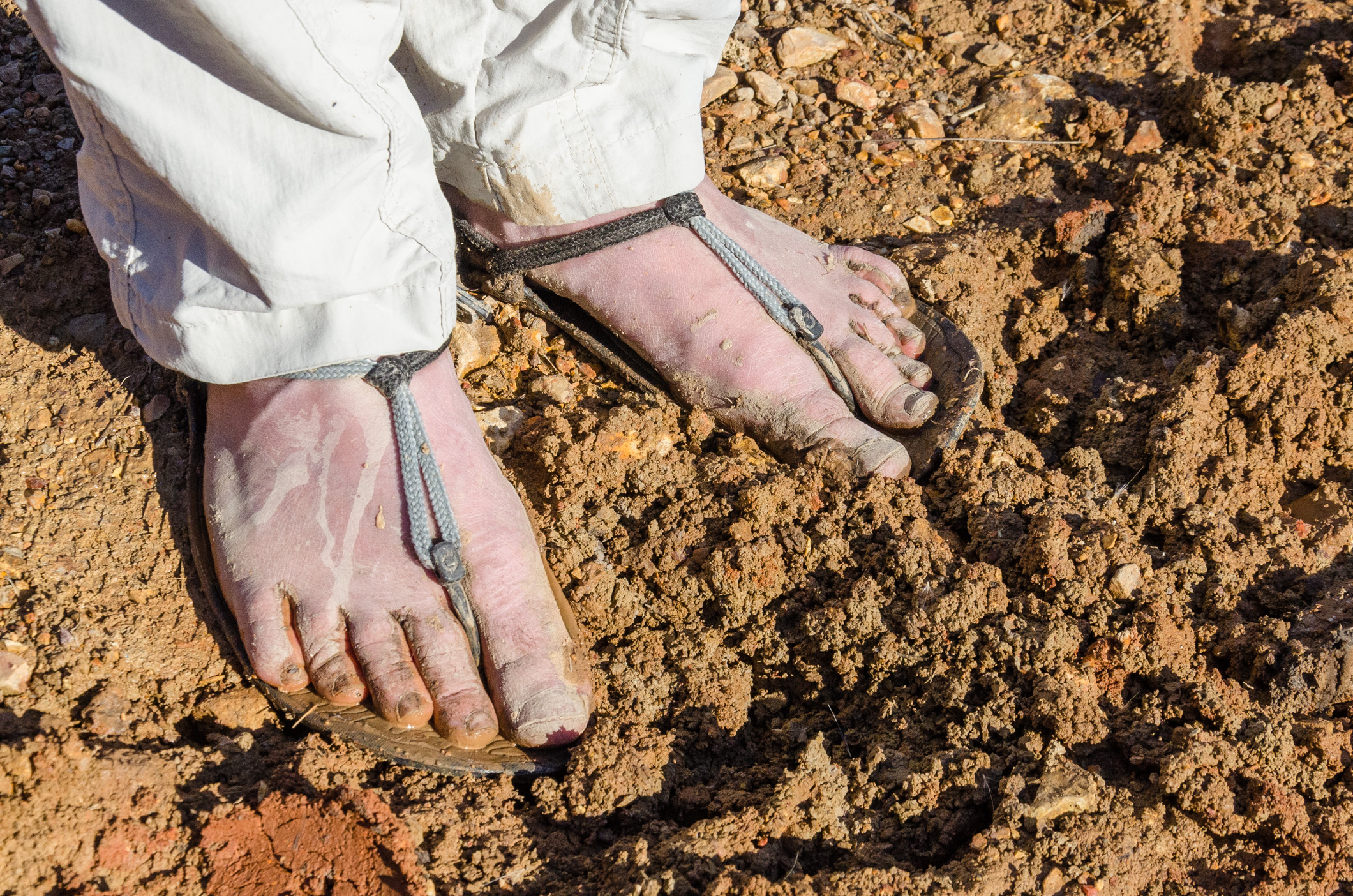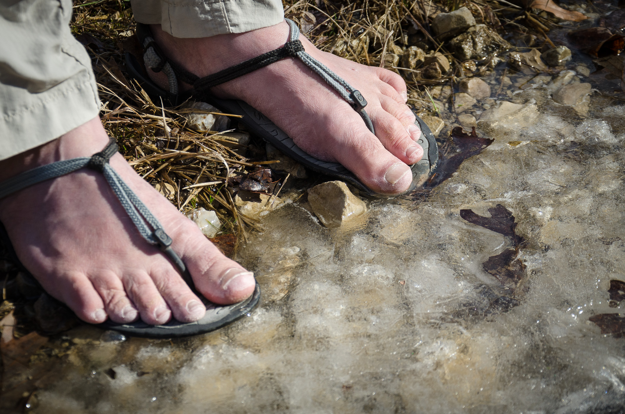 This is only my second real hike in my latest huaraches, and while I like them a lot, they are just a little bit too thin for my liking. I prefer a tad less ground feel and a little bit more insulation. I’m always being asked if my feet get cold. They do on occasion – you cannot walk through frozen mud or water without getting a bit cold. But, I soon dry off and they get warm again. So much so this afternoon that I welcomed a muddier bit of trail to cool me down a bit. I think pictures of how muddy and dirty I get put people off huaraches. Today I just found a clean puddle and washed the mud off – okay the ice in puddle made for a cold wash but it was easy to get clean. Ginger didn’t have the same option with her trail shoes which were very heavy with mud.