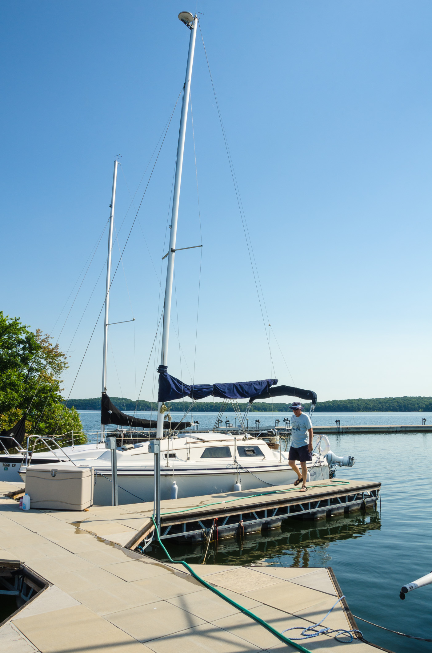 We had to wash out the anti-freeze from the water tanks and pipes before we started – then pump out the waste tank and fill up with gas. There was a wasp nest and several mud dauber nests in the mainsail, and the wasps were not happy. Both John and I got stung. We found another wasp nest in an aft locker. Fortunately wasps and daubers don’t like tick spray (all we had on board). A few squirts made them adandon ship and we threw the nests overboard.