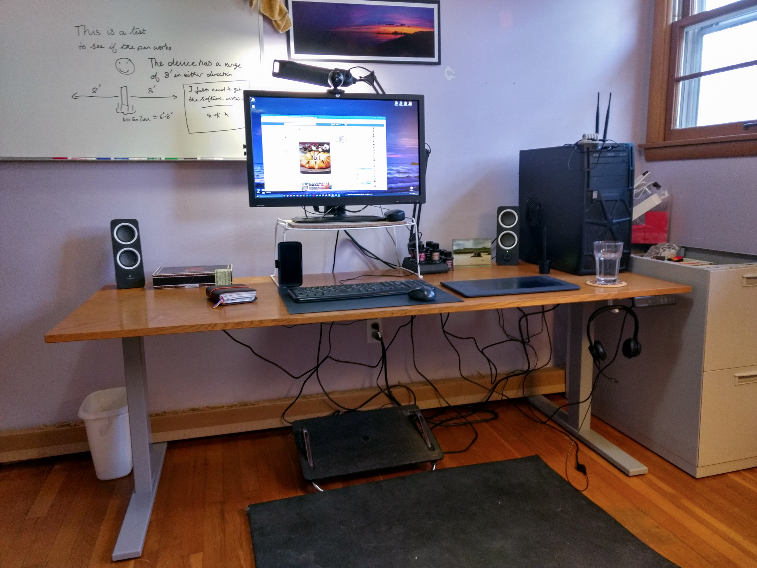 The desk is working really well, and I walk 2-3 miles a day despite not leaving the house. I don’t sit at all during the day, and the main reason I change the height of the desk now is to lower it when I’m taking a picture of something on it. I’ve upgraded my monitor stand so that the monitor can go even higher — the original height was giving me some posture problems. Losing weight has not been as successful. I’m only half-way to my target weight of 157lbs, having lost only 11lbs. My plan to lose weight purely by dieting doesn’t seem to be working, so I guess I’ll have to start exercising more.