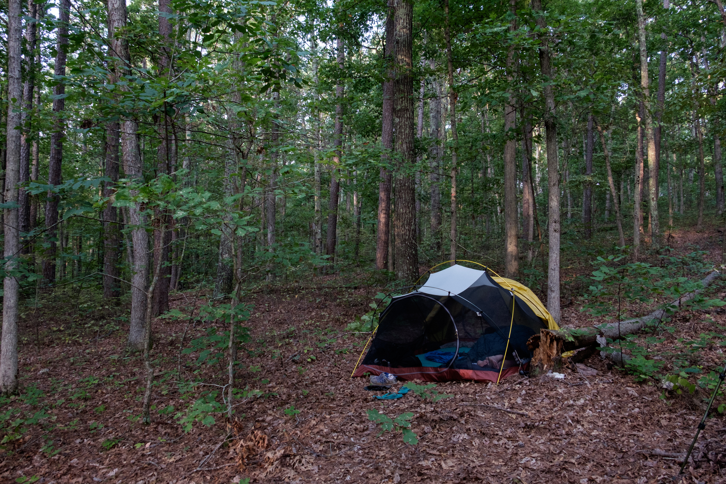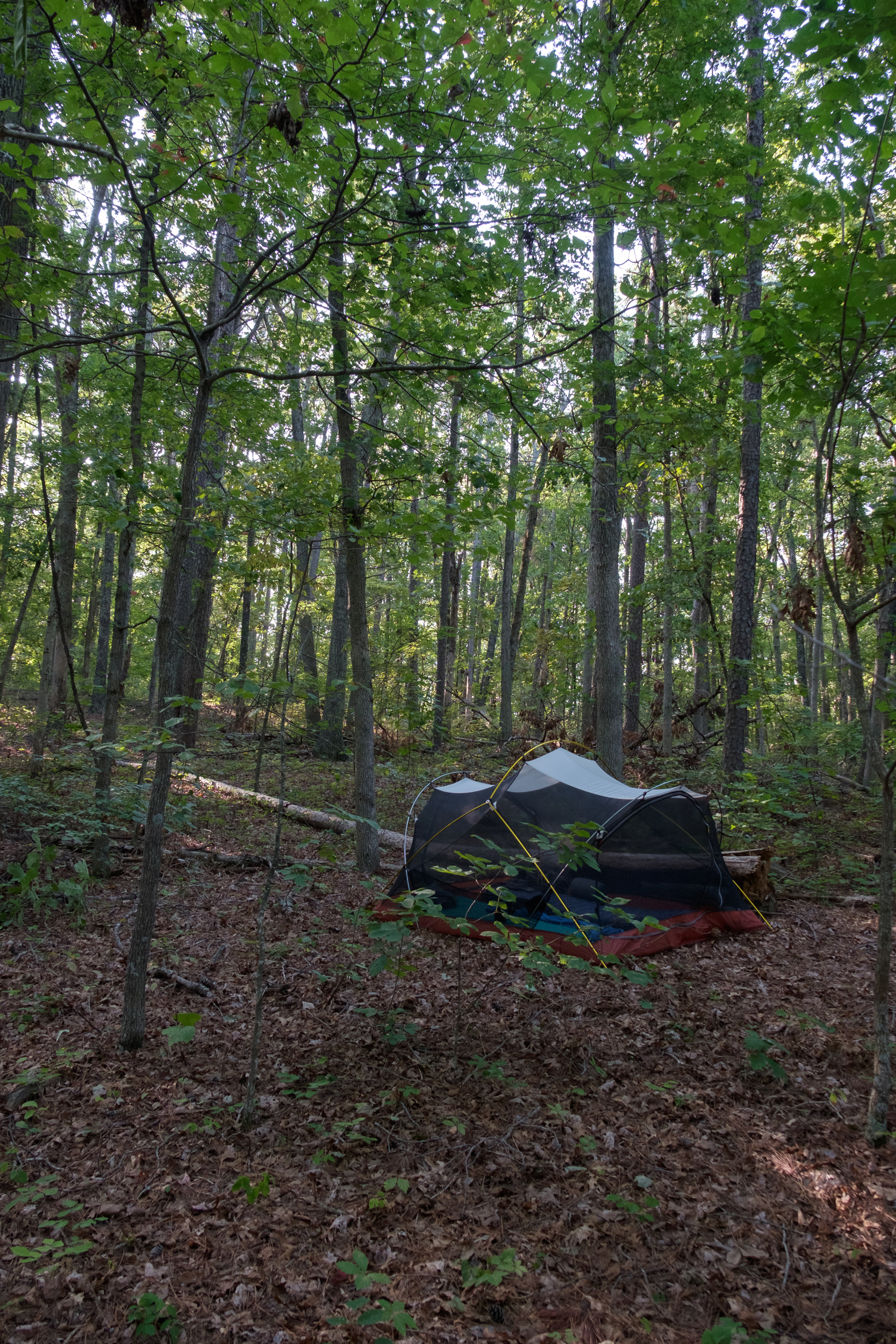 Conscious of the time, distance, and heat, we picked a likely looking ridge that offered the chance of some flat spots, and bushwhacked up off of the trail. The tree canopy cover was fairly dense so there was not a lot of ground cover. We bushwhacked 300-400 yards off the trail before we found a spot that worked. The main problem in finding a spot was the large number of dead standing trees – which we didn’t want to be near. We’ve camped twice in the wilderness when a tree has come down nearby, so we always try to remember to look up and around.