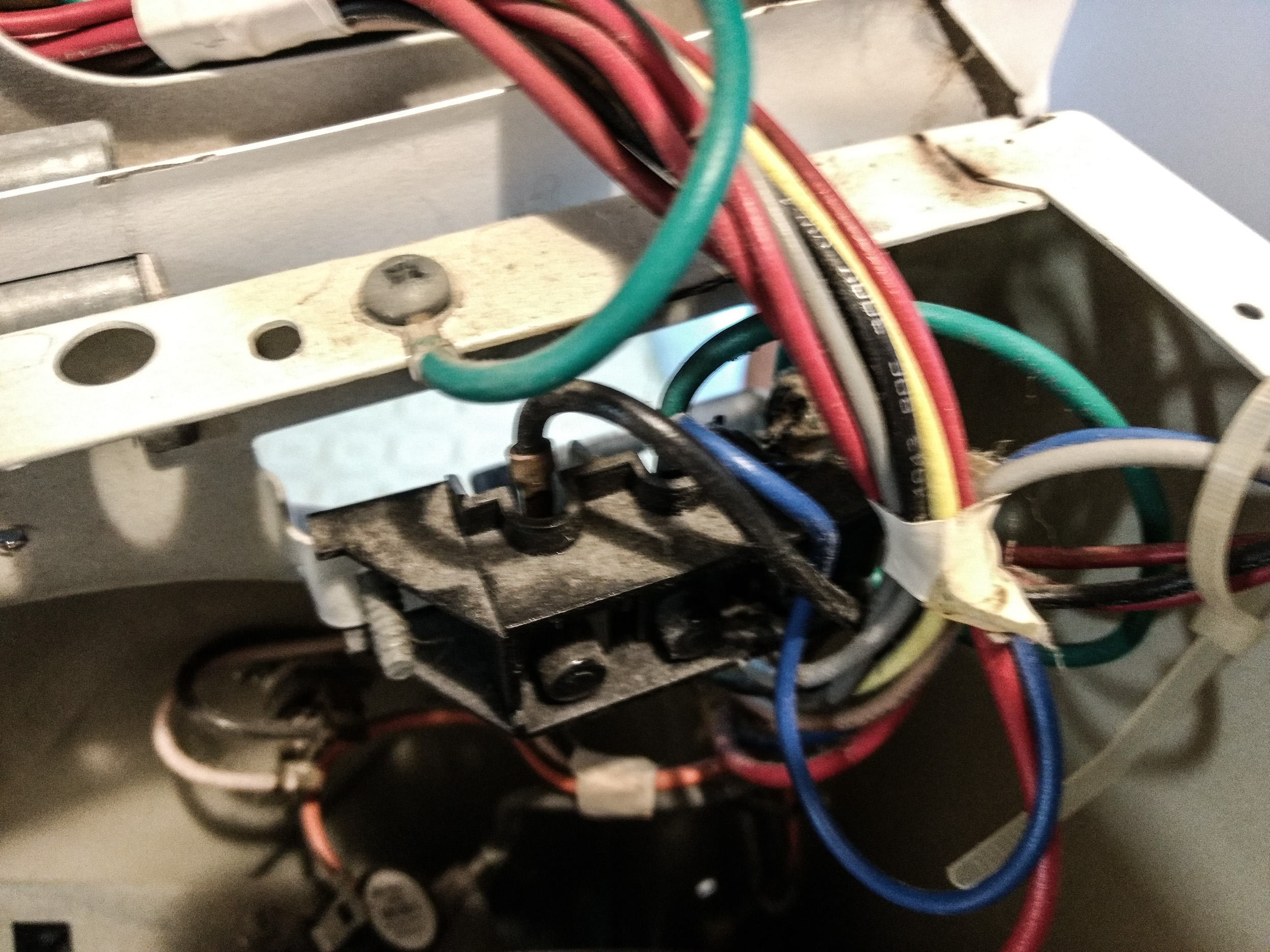 It didn’t take long with my faithful multimeter to work out there was an open circuit on the drier power supply — no real surprises there. The extent of the damage was quite impressive though. One of the wires and the mains connection block was damaged. The block had melted and the insulation was burned off of the wire.