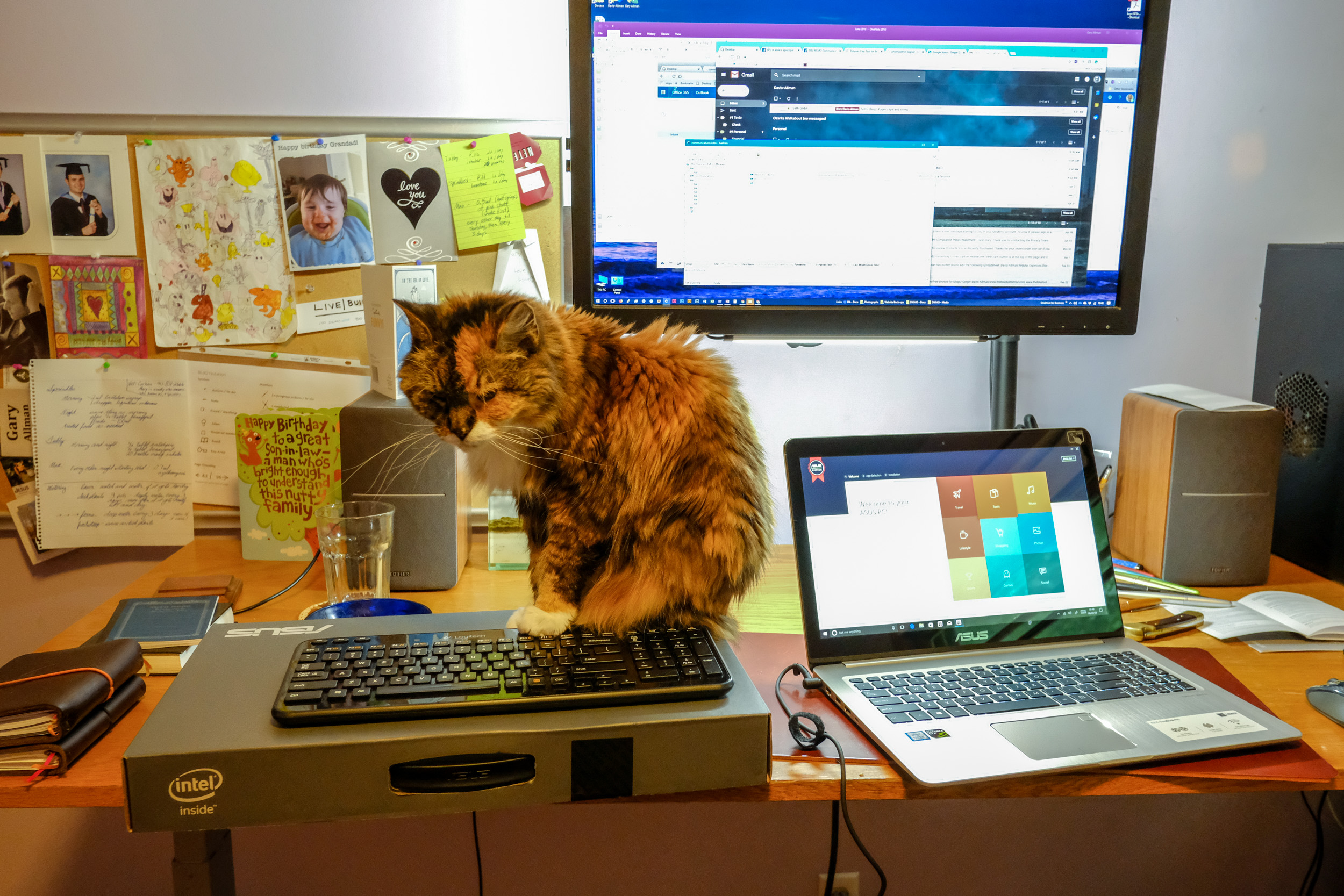 Yesterday I thought Sprinky had finally grown tired of laying on my desk, but no, here she stays, pretty much 24 x 7, She only gets down for bathroom breaks and when I give her her meds — she’s on 150 ml of subcutaneous fluids every day, plus some other stuff she hates, and we argue over every morning and every night.