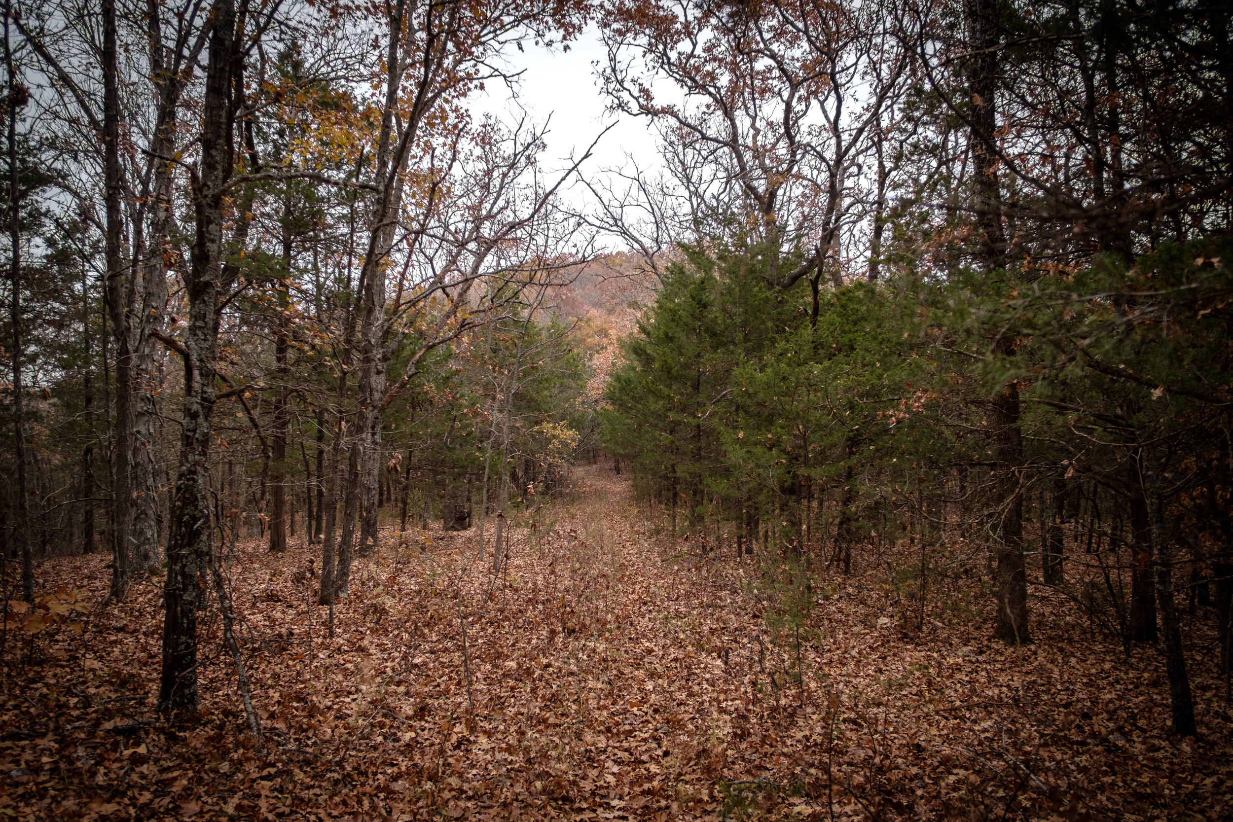 There were a lot of leaves across the trail and I had great fun crunching and crackling my way along the leaf-covered trail which was crisscrossed by shafts of pale but bright sunshine. It was a good day to be out. I had hoped that there would be some vestiges of fall color to photograph, but any leaves that were still on the trees had mostly browned off, leaving things looking a bit subdued.