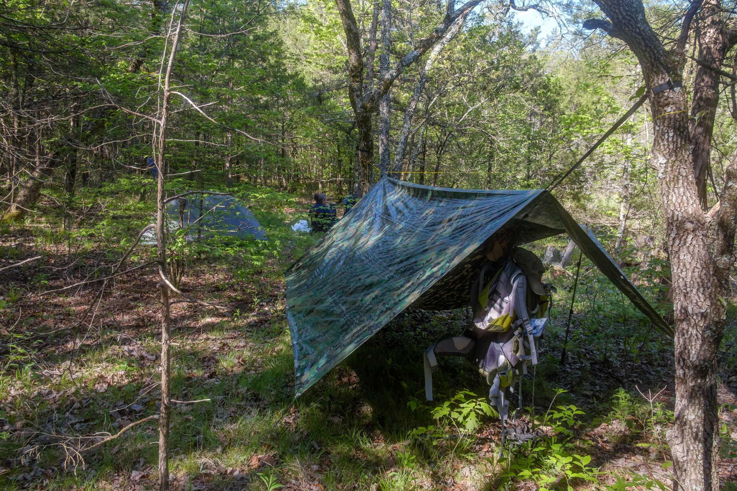 Rain and thunder were predicted for 2:00 p.m. onwards, and right on time the sky darkened, and we had a thunderstorm. We decided to hike through the rain, only pausing to put on pack covers. With rain in the forecast, I had decided to wear a lightweight utility kilt which dries very quickly — unlike the heavy cotton denim kilts. It stopped raining by the time we had arrived at the Cab, and we went off-trail along ‘Cab Creek’ and set up camp at the fire ring I’d found and used four weeks earlier. The small supply of wood I’d left was still stacked to one side. By the time the tent and hammock were up we’d both dried off.