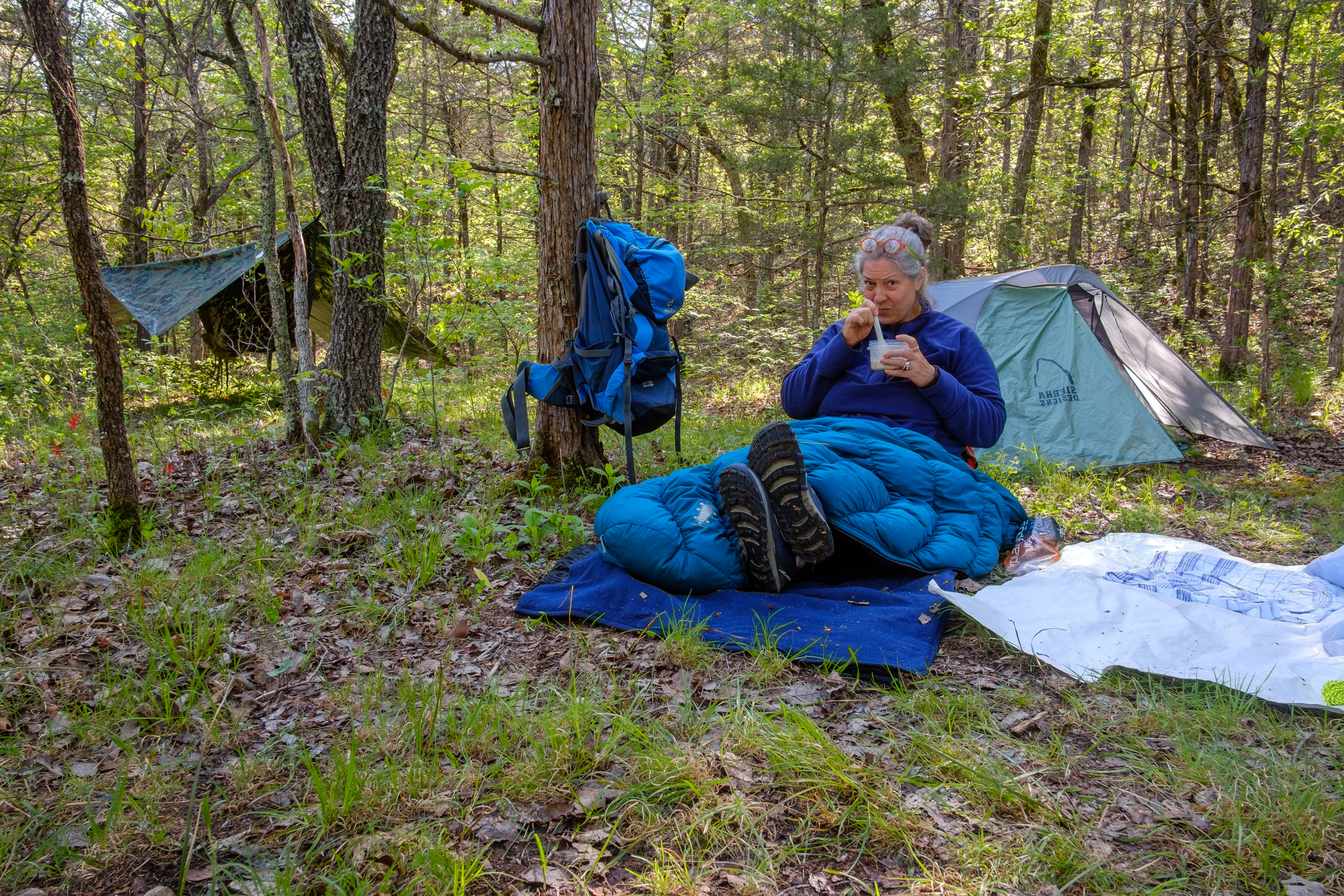 The night was surprisingly cold and quite damp. We were both warm enough in our respective abodes. Ginger in our Sierra Designs Lighting XT 1, one person tent, and me in my hammock. I woke at 6:00 a.m. (as I do every day — sigh), fortunately, I went back to sleep until 8:00 a.m. We had coffee, breakfast, took some pictures, and packed up camp. The hike back from here is uphill a lot of the way. It’s only a couple of miles but you climb nearly 1,000 feet.