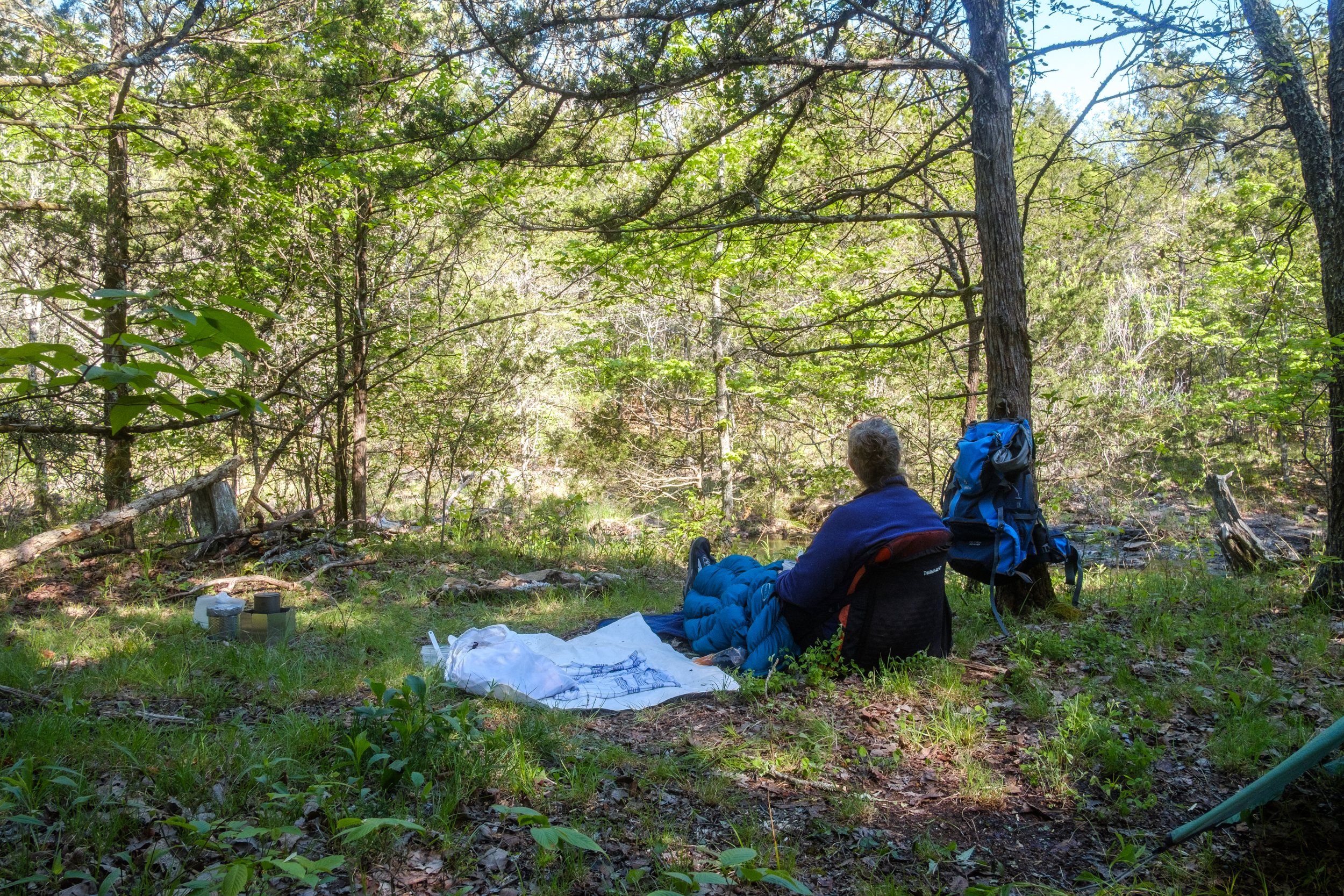 The fire ring is quite close to the creek, and we camped closer than the 100′ restriction on camping near to water sources. However, the hollow isn’t very wide here, the hill starts to climb up immediately behind where we camped. Where we set up camp was clear of brush, and a lot less damaging place to camp than up the hill in the brush.