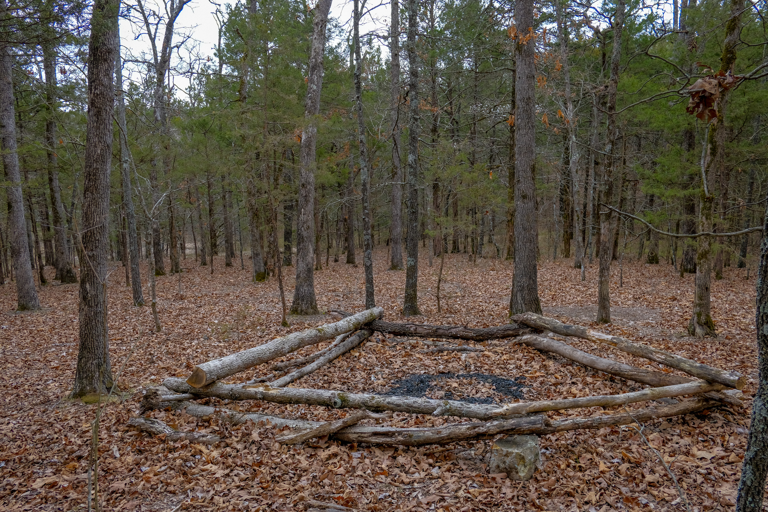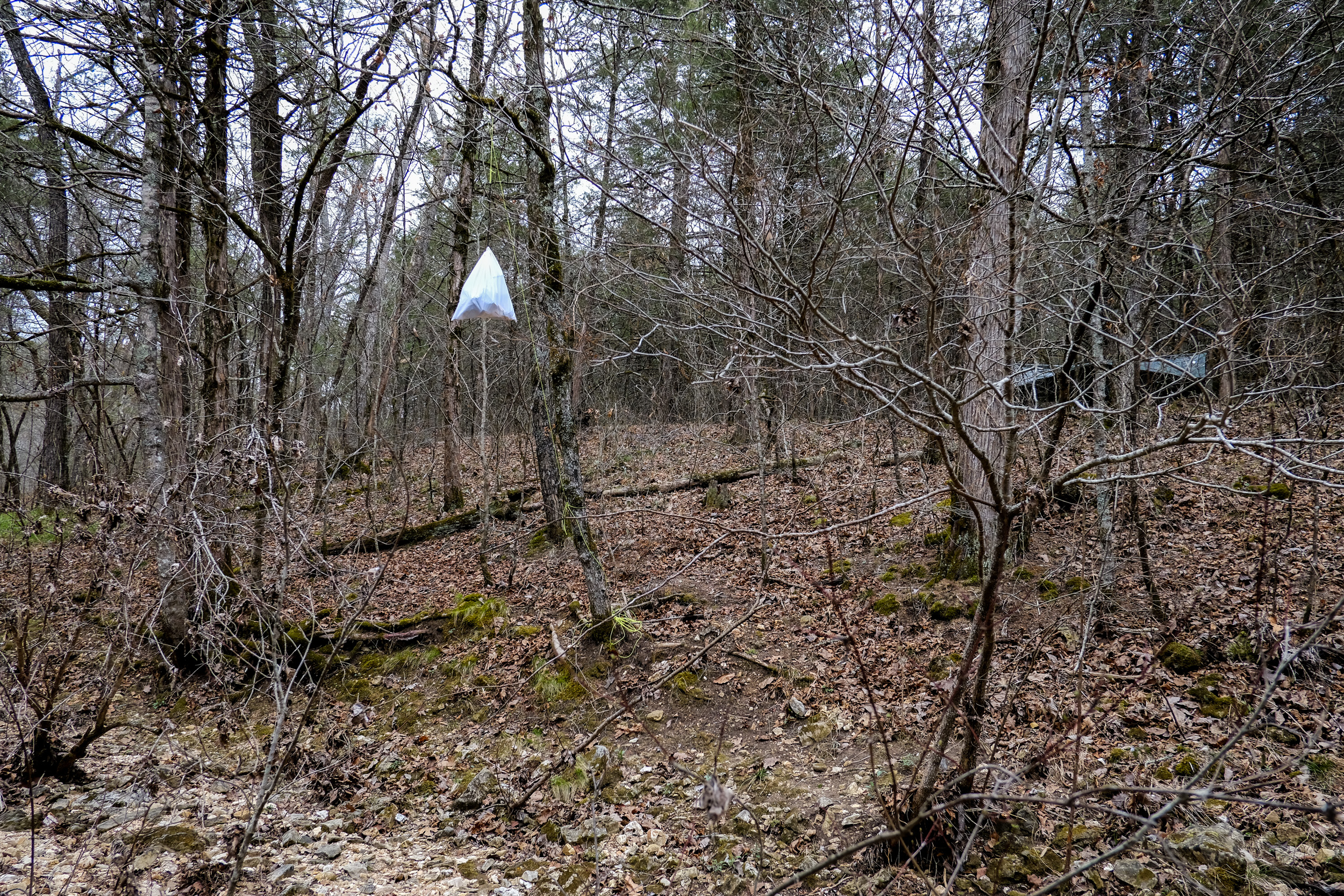 The campsite I hoped to stay at, was one of two about 50-100′ apart. The first site is right by the trail, the second, the one I planned on using, is set back from the trail further to the west, and has easy access to the creek. There were a couple of guys tarp & hammock camping in the first spot. At this time of year, with no undergrowth or leaves between the two sites, it would not have been appropriate to set up camp where I originally planned. I chatted with the guys — on their first visit to Hercules, and then set off to find a spot a few hundred feet to the west (downstream).