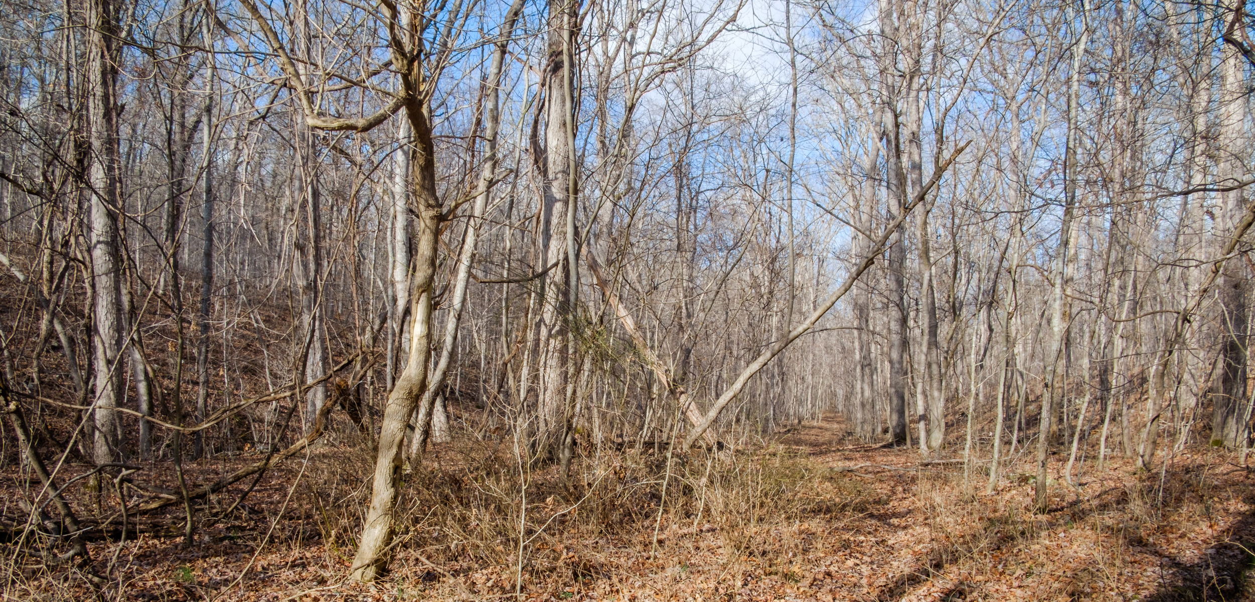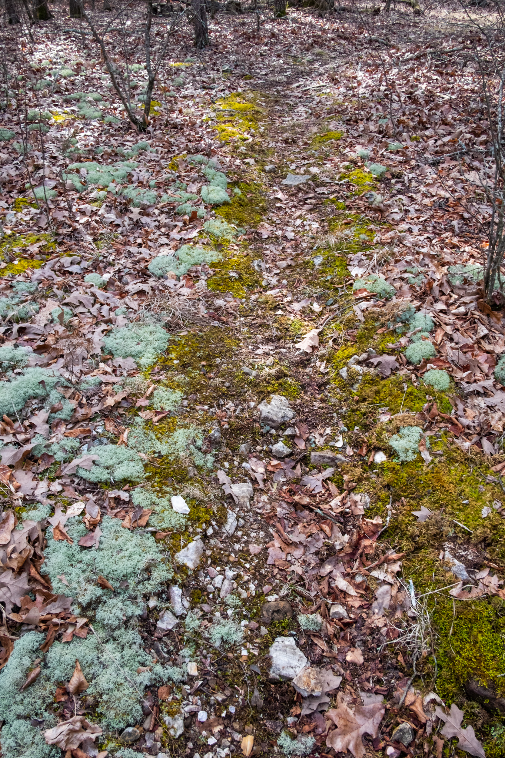 The Collins Ridge trail Starts with a long slow climb of 300′ in slightly less than a mile. I surprised myself by making it to the top in half an hour. Thereafter the trail is fairly level running through woodland. One long section runs straight west to east, and at a fallen tree it looks like a lot of people go a long way off trail to the south. I discovered that the trail continues on the other side of the fallen tree, and there’s no need to go south at all. Interestingly the trail marked on my map showed the detour to the south, so whoever made that track was lured off-trail too. By eleven forty-five I was at the Devil’s Backbone Trail junction. Near there I met a bunch of guys on horseback — the only people I saw on the entire trip — One asked if there was anything to see. “Just trees and leaves.” I replied. By noon I was back at the parking lot and ready to set off to Hercules Glades for my next hike.