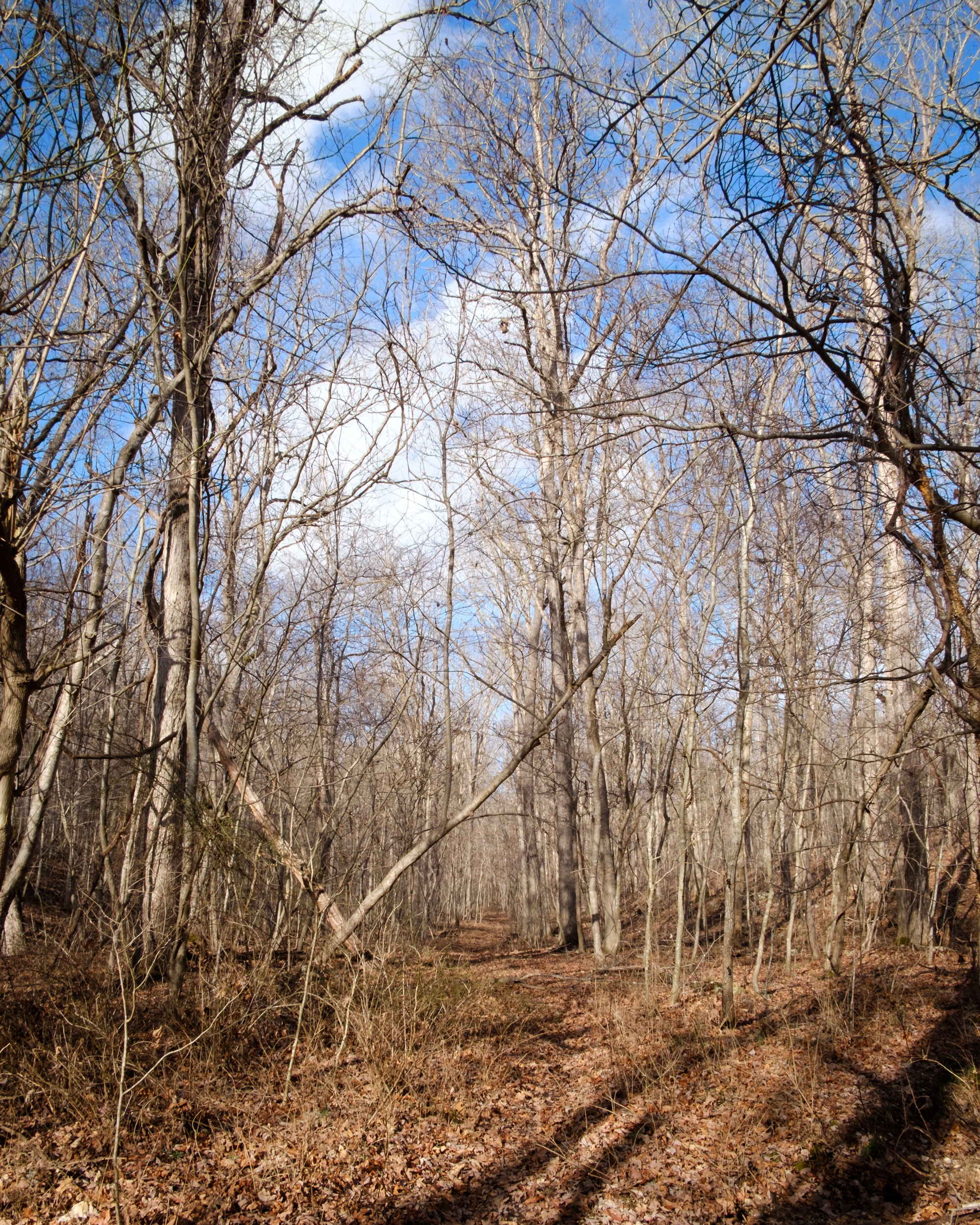 When I arrived at my planned camping spot I realized that the ridge wasn’t high enough to block the wind, and there was a distinct lack of vegetation to provide screening — Anywhere I hung the hammock would be quite visible from the trail. Not that there was anyone on the trail, but I like to be out of the way. A quick look at the map showed a nearby hollow running northeast/southwest that had steep sides and it was well off of the trail.