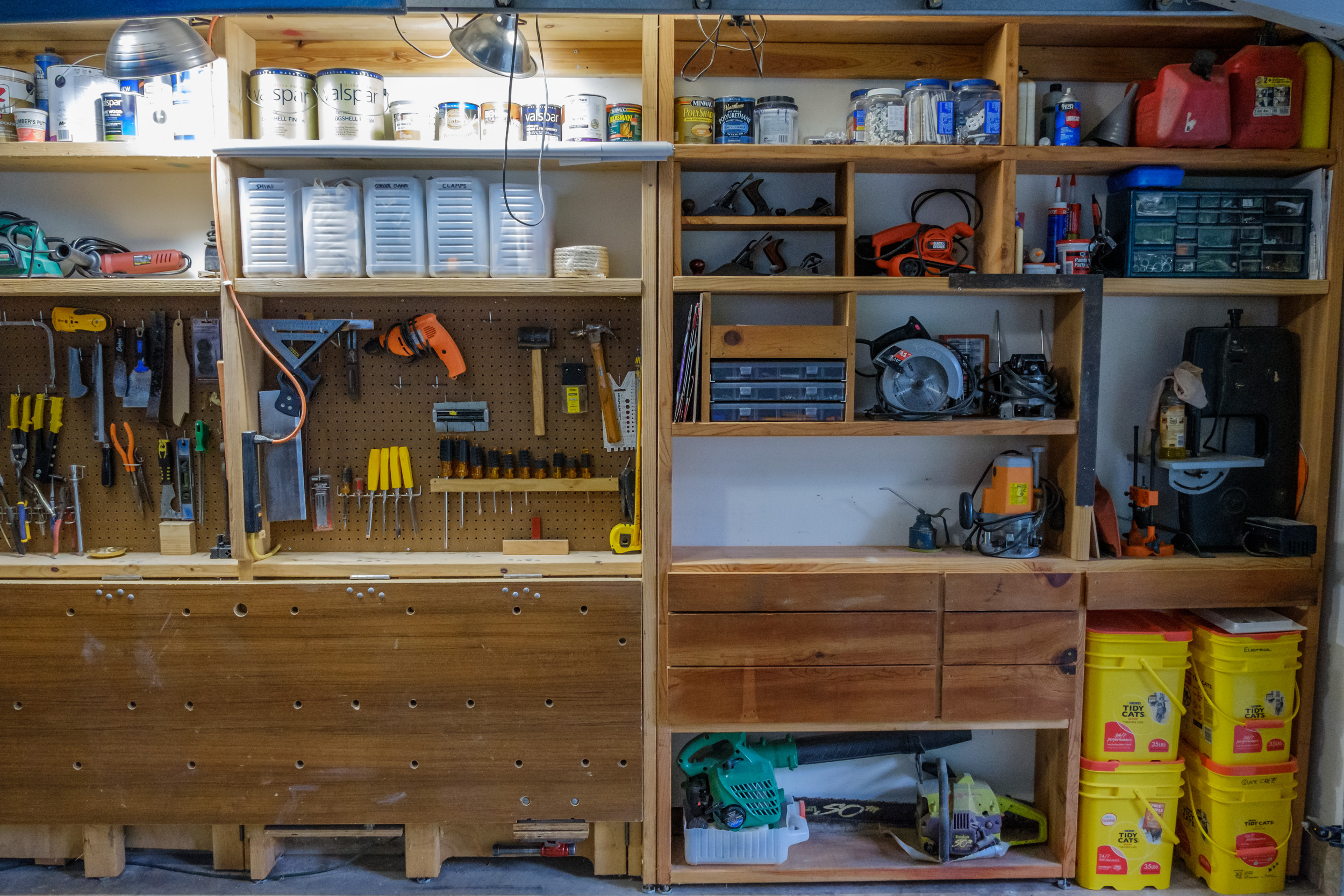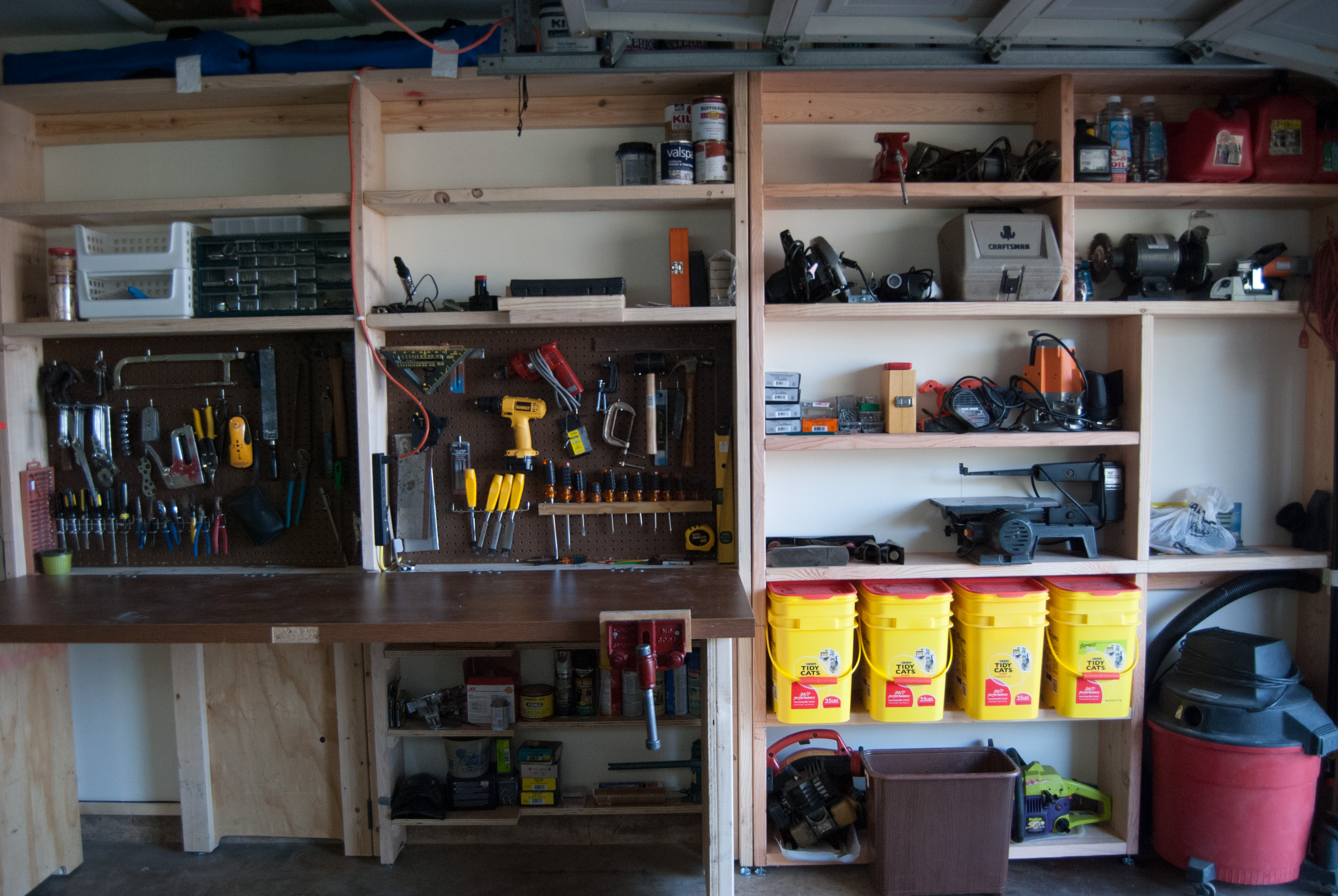 One of the main goals of the project was to try and declutter and improve access to everything. A major issue with the original build of the workbench and storage was that I used a load of cat litter boxes for storage. The boxes are great, but they stuck out four inches and would catch on bags and clothing as you walked past. Some of my tools stuck out a bit too. Changes were needed.
