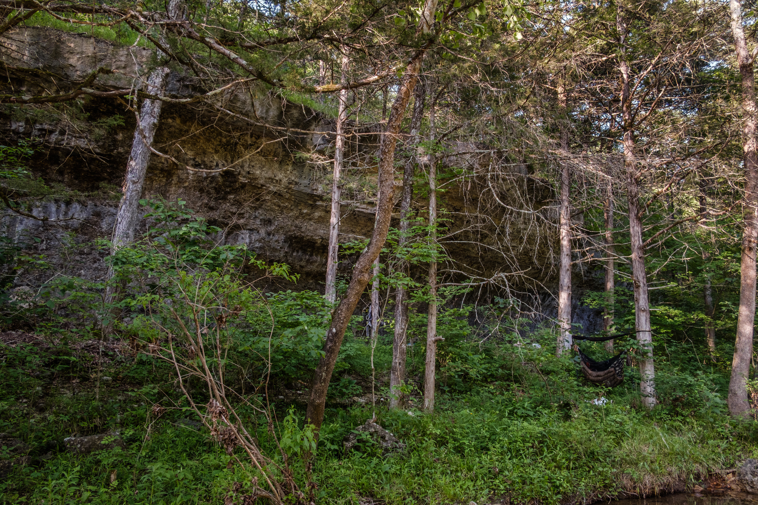 Looking west — downstream. I didn’t venture any further downstream. That’ll have to wait for another trip. Below are a couple of views of the surroundings, including my hammock set up for the night.