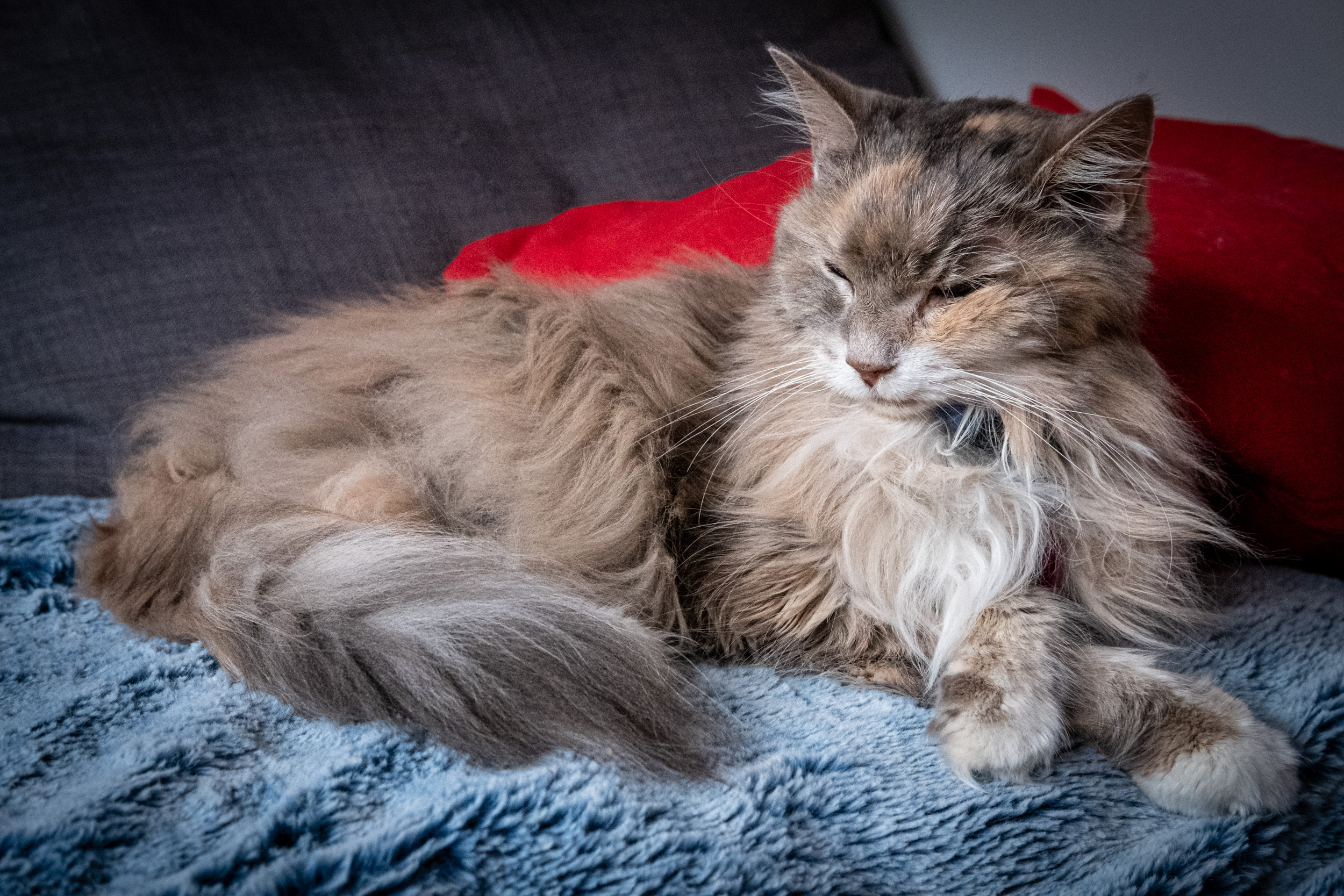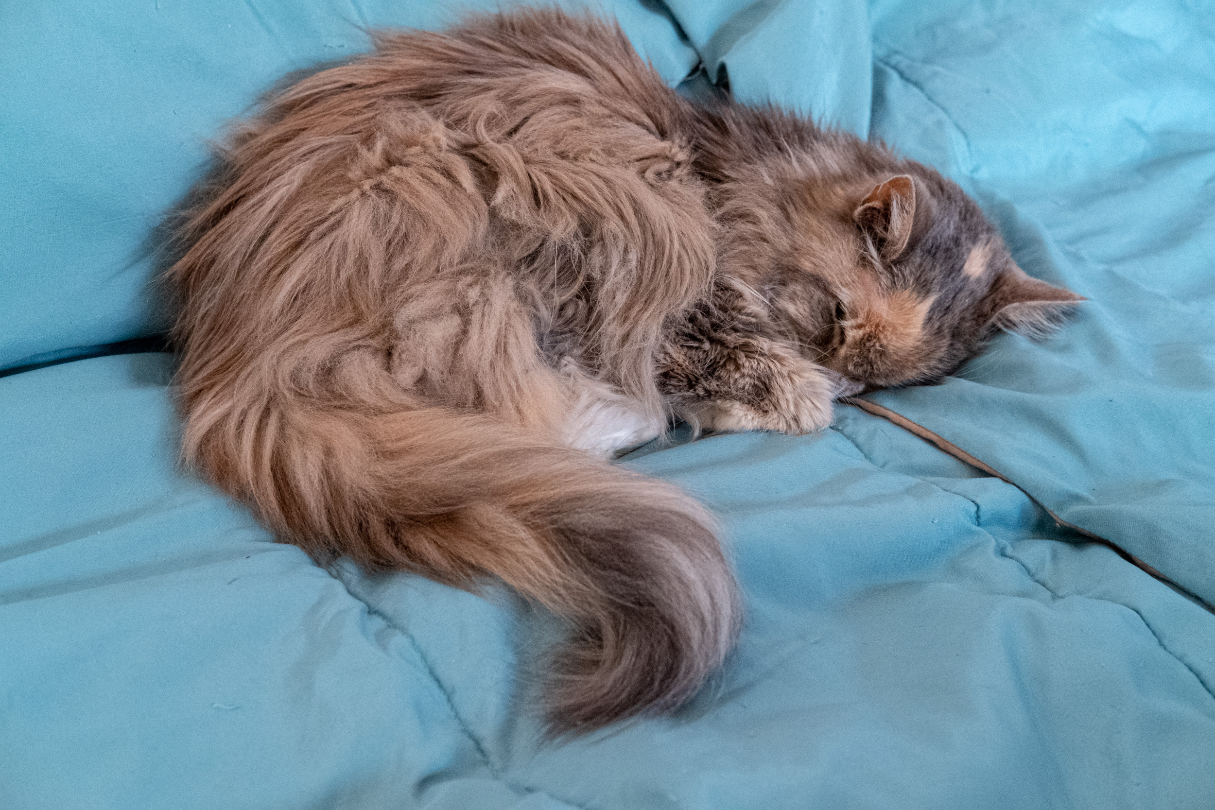 We recently discovered she had a large tumor in her abdomen, and she’s been wasting away quite rapidly. Which is a shame as since Sprinkles left us Mao had come into her own and almost become a real cat. She’d taken to sitting on the back of the sofa behind us and has been sharing my pillow at night for quite a while.