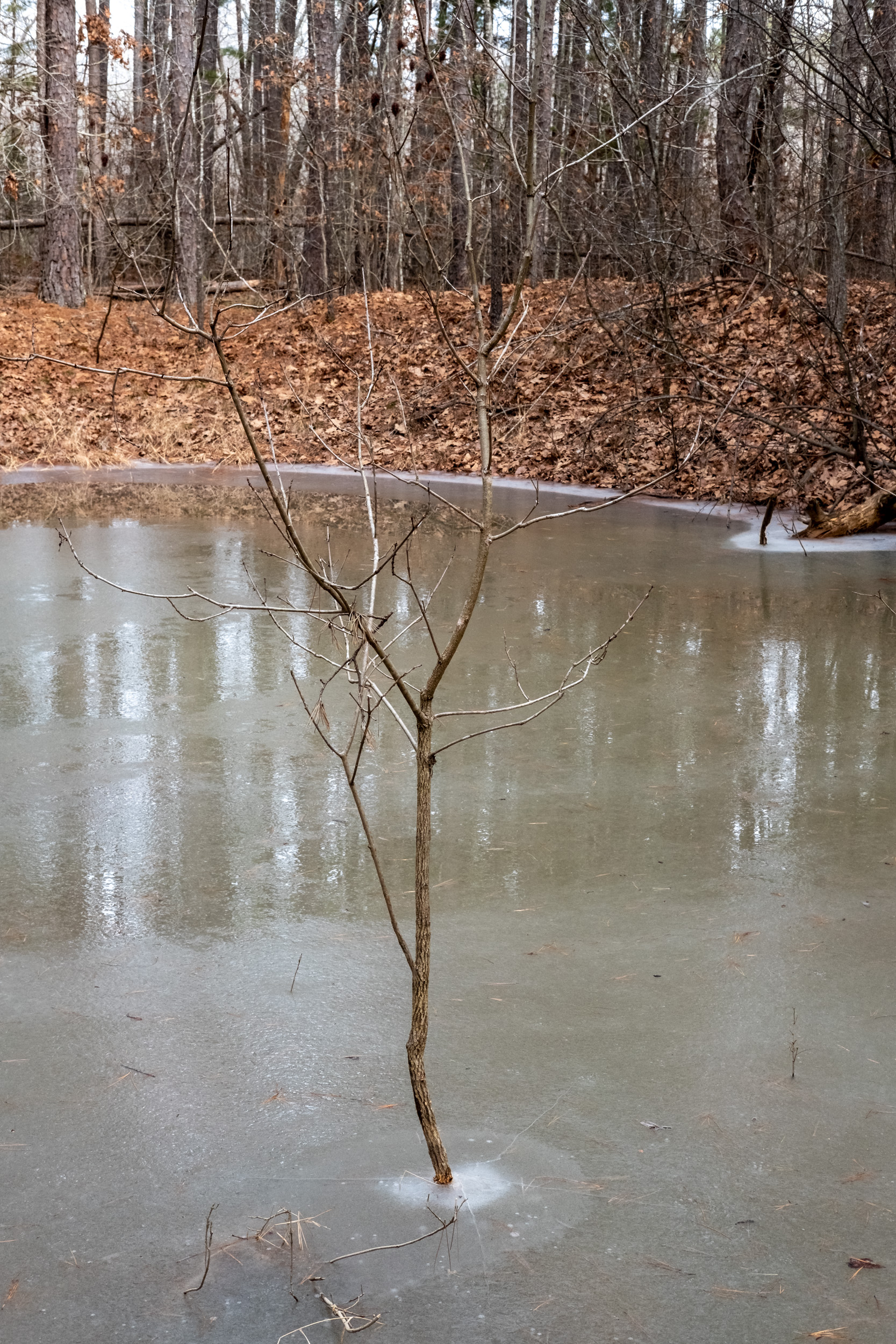 The south loop started off going through some pine forest, and the ground was very wet where it wasn’t icy. So was the stock pond.