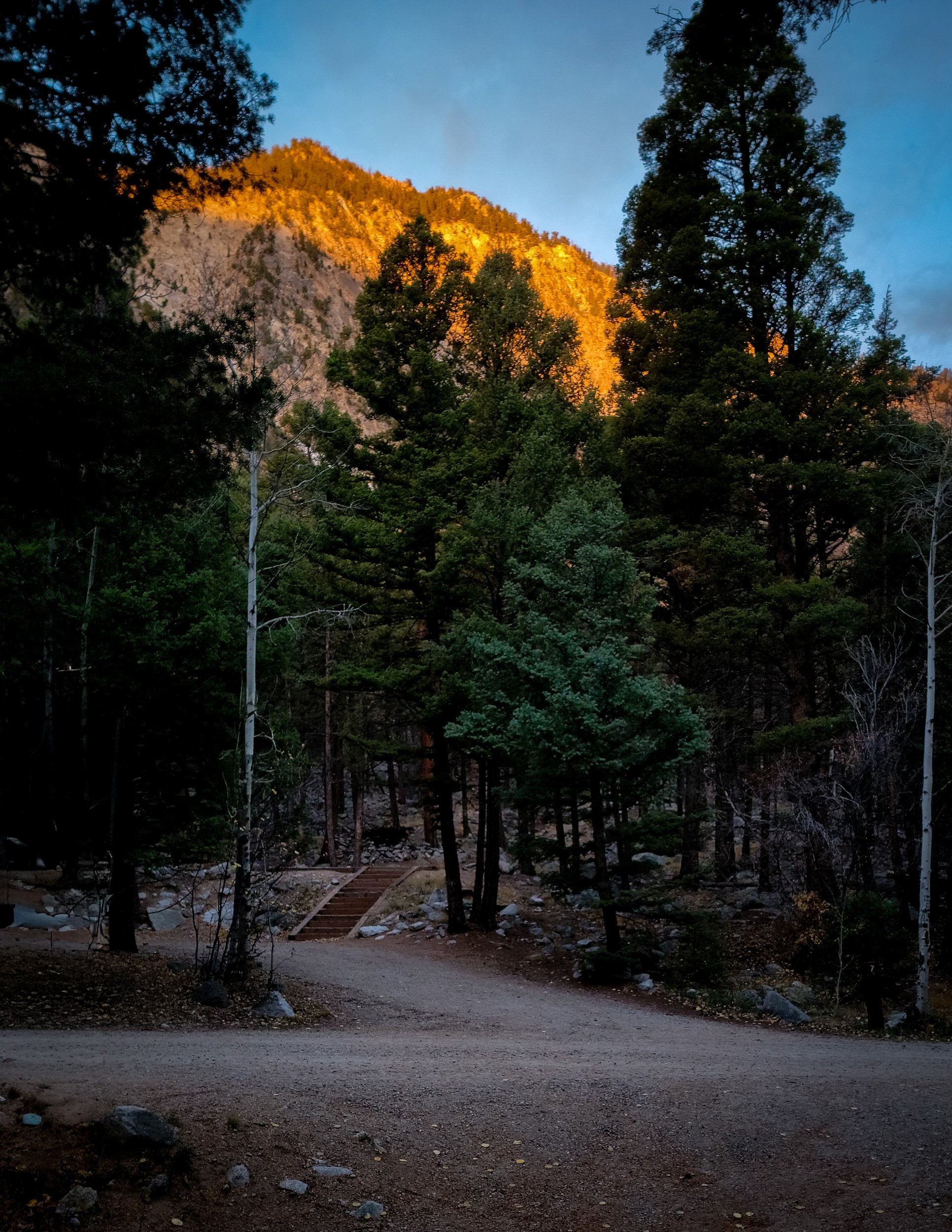 Sunshine on the cliff tops — Just after seven the sunlight caught the tops of the cliff behind the campground. Time for a quick picture, finish packing everything away in the car, and get on my way. Day 9 – Road Trip, October 2025. Copyright © 2025 Gary Allman, all rights reserved.