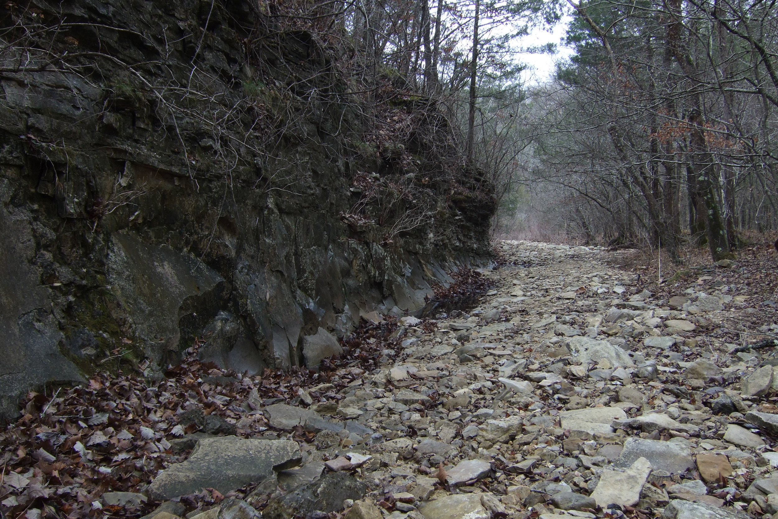 Ginger makes the early morning coffee in the Hercules Glades Wilderness. Copyright © 2010 Gary Allman, all rights reserved. The bags did well, we were warm and cozy. We woke to a cloudy morning that felt more chilly than it was, likely around 50°F. Coffee, breakfast, breaking down the camp, and pumping some water. Soon it was nearly noon and we had a full day’s hike ahead. But before we left the area, we had a nose around Devil’s Den, an interesting little creek bed flanked by steep hills on both sides.