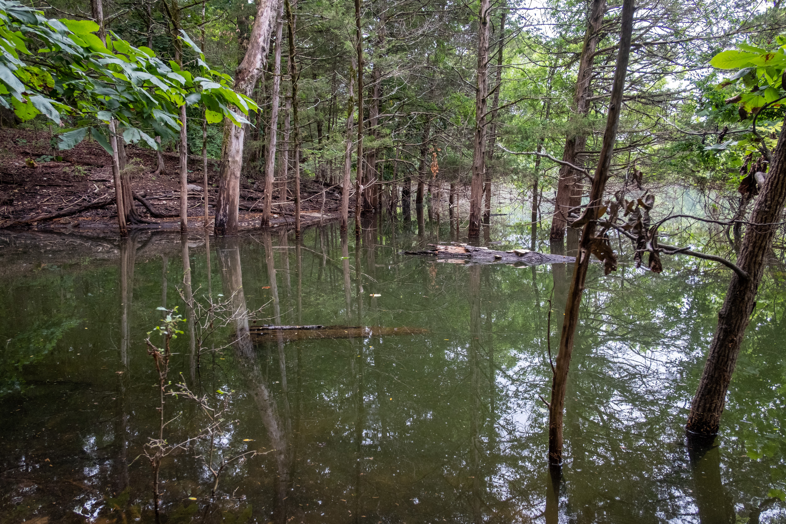 Once down on the flat ground near the creek, I kept on expecting to meet the lake, but at its then level (it had been around five feet higher I later discovered), it reached just to where the Farm Track Trail met Piney Creek.