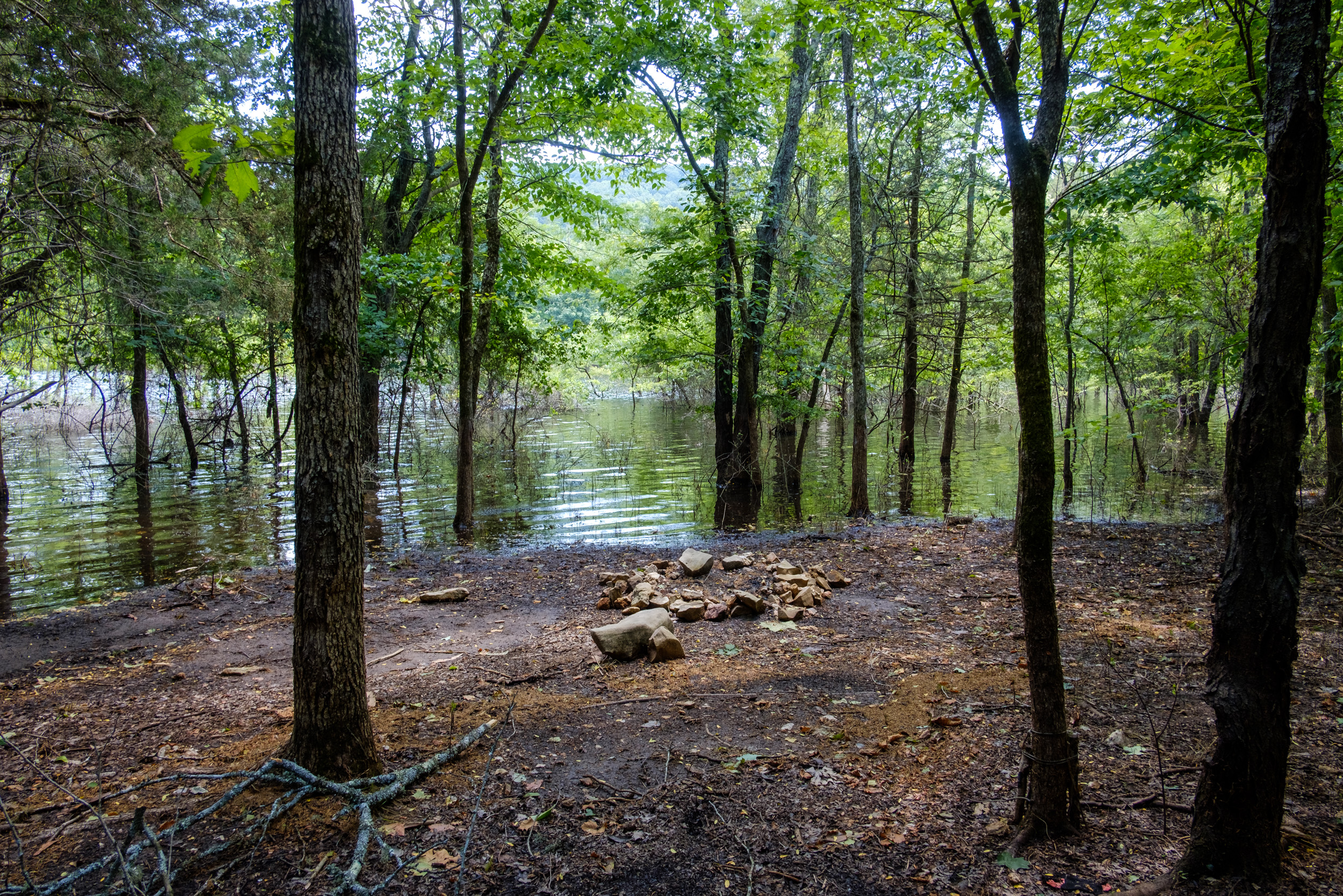 Dry Falls – Pictured in the sunshine on Sunday. Piney Creek Wilderness – Day Three. Copyright © 2020 Gary Allman, all rights reserved. After a few hundred yards the underbrush cleared away completely and I could see light through the trees ahead. I realized I was at one of our old camping sites by the lake, and the water was lapping up around the fire ring.