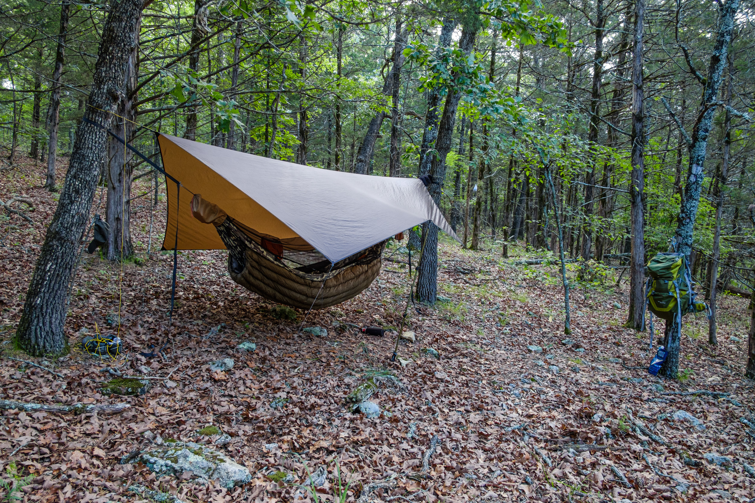 Camped behind the bluffs at Hercules Glades – The edge of the bluff shows clearly in the distance. Copyright © 2019 Gary Allman, all rights reserved. Here I am all cozy, fifty yards or so back from the bluff. The foliage on the edge of the bluff was so thick I didn’t bother to try and set up my hammock with a view out over the bluff.
