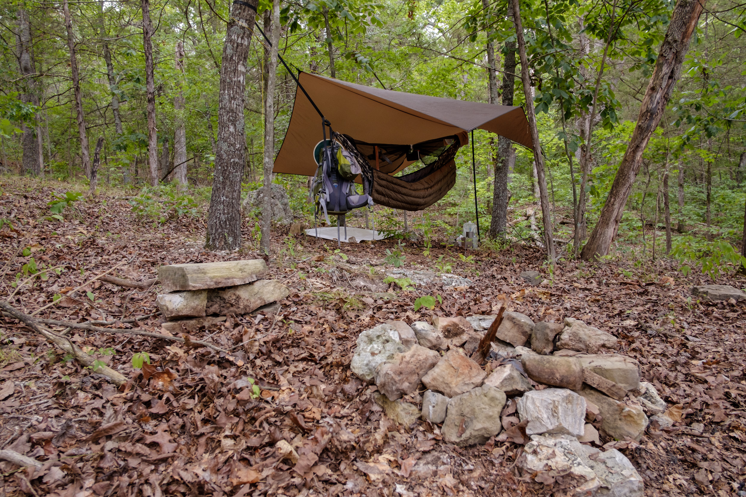 - Always hang the tarp first. That way I know the trees are far enough apart before I hang my hammock.
