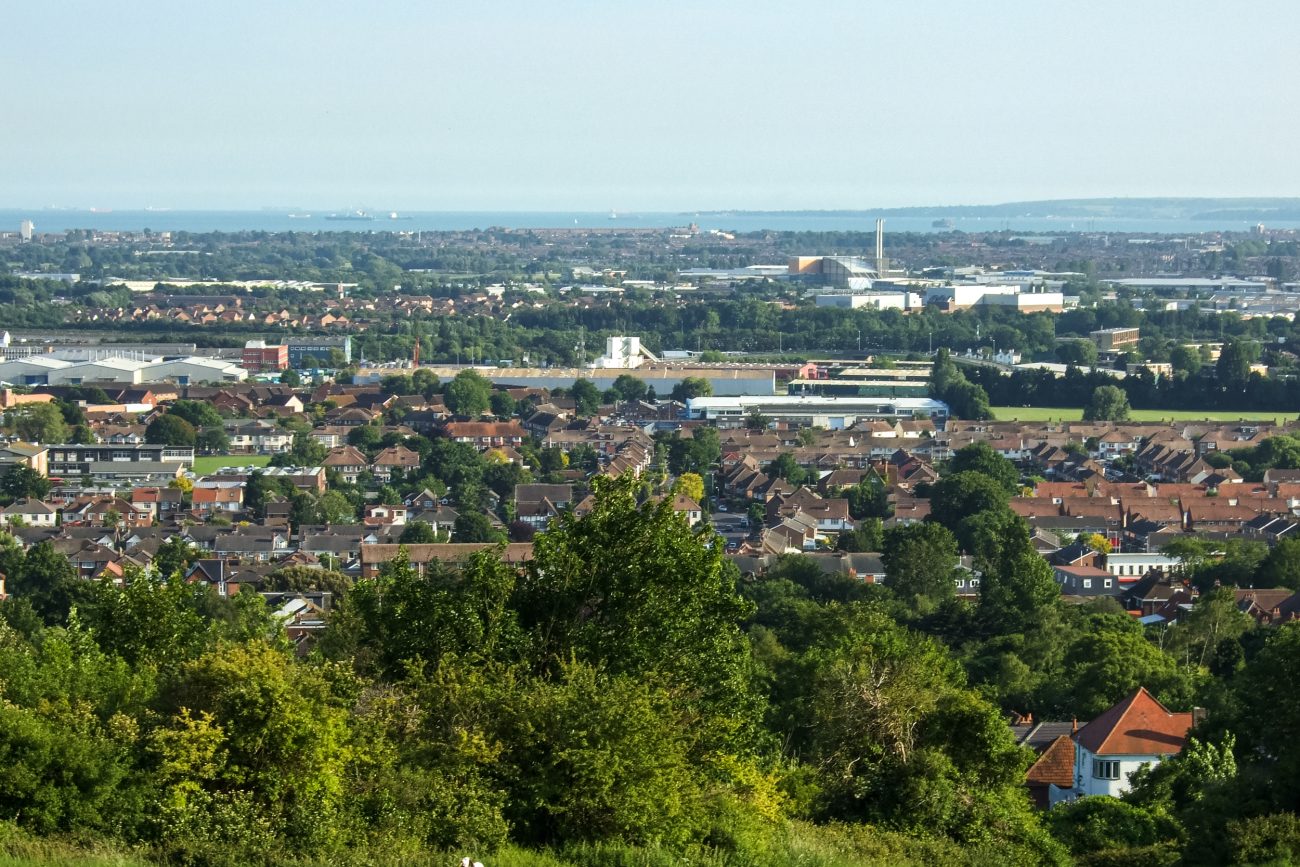 View from Portsdown Hill — This is the view over Portsmouth from Portsdown Hill, with the English Channel, Solent, and Isle of Wight in the background.